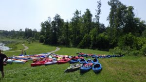 Płyniemy w stronę Siewierza, kiedyś można było przepłynąć przesmykiem zostawiając po lewej stronie wysepkę. Dziś to się nie udało nie ma wysepki , jest połączona ze stałym lądem. Tak mało wody. Próbujemy dopłynąć do mostu na DK 1 nad Czarną Przemszą w Siewierzu. Nie daje się i dużo drogi nam do niego brakuje. Musimy zawrócić w ujściowej zatoce. Jest tak płytko , że wiosłami machamy w mule 🙁