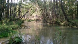 Już po kilkunastu minutach spokojnego wiosłowania natknąłem się na płynącego w przeciwnym kierunku gościa stojącego na desce , tak zwanym SUP ie. Pierwszy raz taki widok na tym jeziorku 🙂