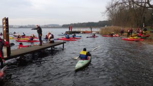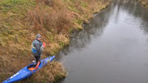 Dzień ponury, ale przynajmniej nie pada. Ludziki się zjeżdżają. Poznaje się z Prezesem – Krzyśkiem i resztą ekipy. Załadunek kajaków na przyczepę i odjazd w kierunku Bohumina. Miła konwersacja na tematy kajakowe i w mig jesteśmy w Raciborzu. Tutaj wysiądę i popłynę sobie do zaparkowanego przy Szkwale, transportowca. Dziękuję kierowcy i współpasażerom za wspólną przejażdżkę 😉 Mogę startować. Przede mną 40 prawie kilometrów. Ten odcinek ostatnio płynąłem w czasie Polsko-Czeskiego Maratonu Odrzańskiego w 2013 roku. Po wejściu do kajaka okazało się , że po ostatnim jego pływaniu nie dosięgam do sterowych pedałków 🙁 . No tak , przecież ostatnio płynął na nim Daniel, a Daniel jest ode mnie sporo dłuższy ;-). Zapomniałem. Dziesięć minut i mogę już popłynąć.