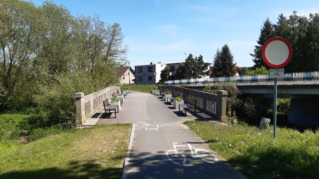 Po sześciu godzinach wiosłowania, za mną 24 kilometry, czyli średnia 4 km/h a przede mną drewniany mostek, tak niski i zarośnięty , że muszę go obejść. Nad nim tabliczka o całkowitym zakazie wstępu do lasu z powodu bardzo starych, zagrażających życiu i zdrowiu, drzew. Nie wchodzę do lasu, wracam na rzekę.