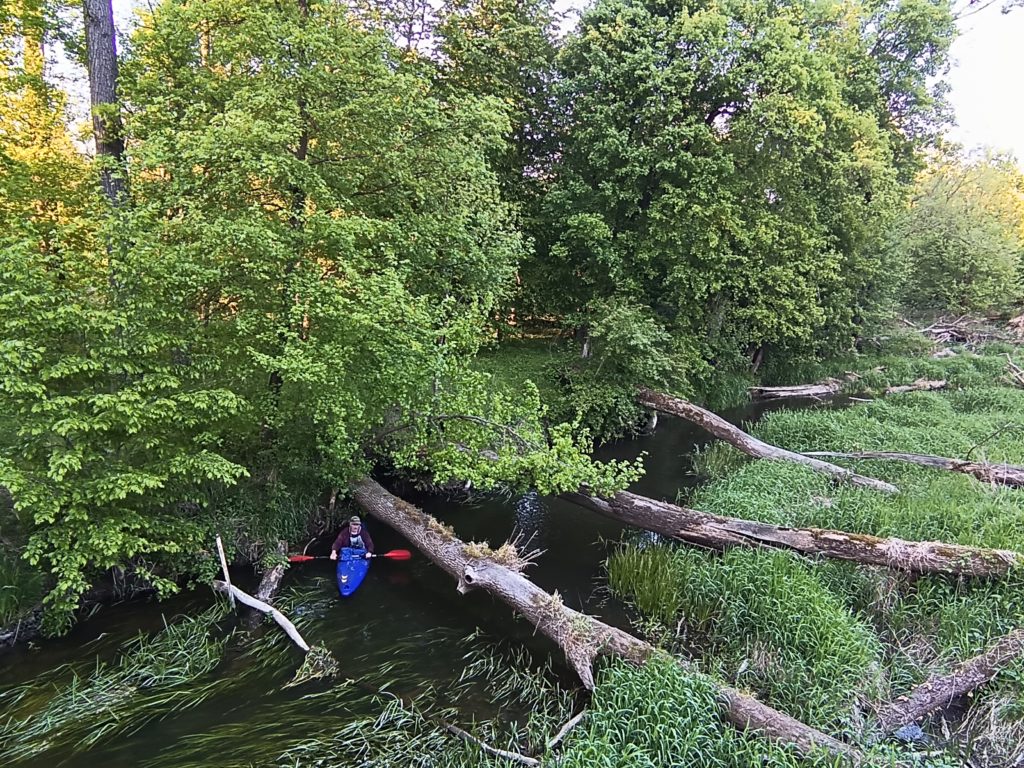 Za drewnianym mostkiem mijam granicę rezerwatu Lutynia. Zaczyna się odcinek mocno zwałkowy wręcz hardkorowy. Kilometr do mostu na którym czeka na mnie żona zajmuje mi blisko pięćdziesiąt minut. Drzewa które udaje się pokonać bez wychodzenia z kajaka, drzewa których nie udaje się przebyć w kajaku. Z obniesieniem problem, nie ma śladów wydeptanych ścieżek a teren podmokły. Muszę kombinować stąd taka zawrotna prędkość…