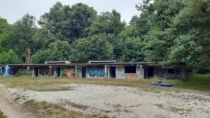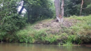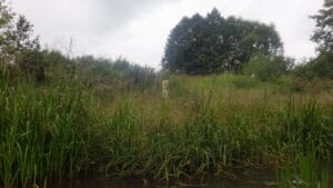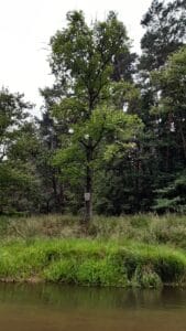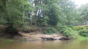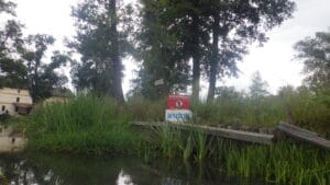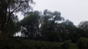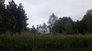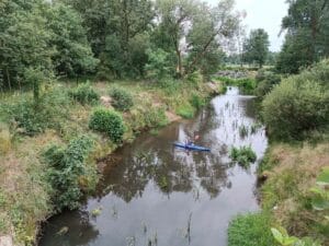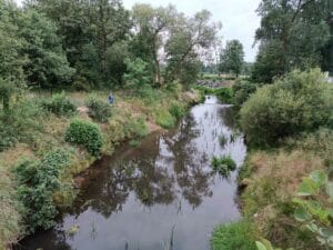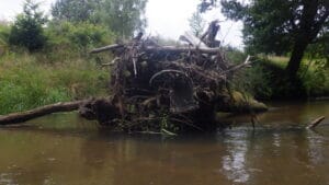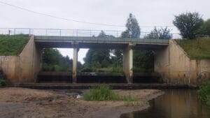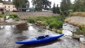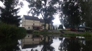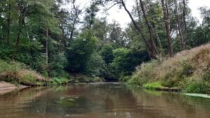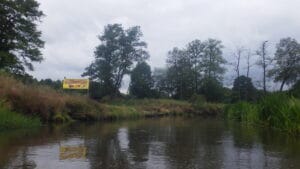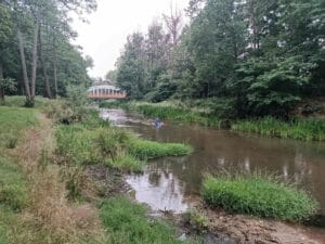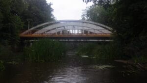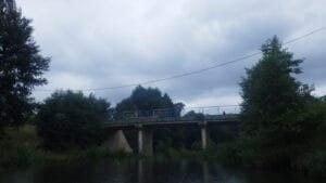 Tu przenoska obowiązkowa, prawie cała woda płynie na młyn więc do połączenia z młynówką będzie tarcie dnem kajaka o dno rzeki bo wody malutko, ale po wyjściu z kajaka widzę startującą dwójkę męsko dziecięcą, więc mam kogo gonić ;-). Obnoszę, odpływam przekąszając bułeczkę, więc tempo słabiutkie, prawie żadne. W końcu młyn oddaje wodę, mogę pogonić 🙂 . Pół godziny zajmuje mi kręcenie, to w lewo, to w prawo i widzę po lewej ten obiekt przypominający kościół, a który nie wiadomo czym jest, a jest coraz mocniej ogrodzony i zmienia się wizualnie, z tym że nie jestem pewien czy na lepsze. Będę obserwował i porównywał, bo kiedyś chodziłem obok robiąc zdjęcia. Dziś odpływam by po pięciu minutach zobaczyć elektrownię i most w ciągu ulicy Kilińskiego w Zawadzkich. Na moście goście przenoszą kajak z prawego na lewy brzeg. Ja tradycyjnie od razu dobijam na lewo. Choć mocno zarosła tu rzeka i brzeg łącznie z tabliczką informującą i ostrzegającą przed niebezpieczeństwem, to można podpłynąć tu bliżej mostu. Obnoszę a na głowę znowu kapie deszcz . Za mostem stoją dogonieni przeze mnie kajakarze, młody z ojcem (chyba), żartuję sobie, że nie lepiej było wybrać się na wodę wczoraj, gdy pogoda była zdecydowanie lepsza, na co gość odpowiada, że wczoraj też płynęli, bo oni płyną już od Żyłki. Łał. Muszę zapamiętać że nawet z dzieckiem można spłynąć te siedem kilometrów wyżej. O ile z Krupskiego Młyna płynąłem już kilkanaście razy to powyżej tylko raz i to 36 lat temu. Zaplanuję to na październik 2025. Wtedy nie ma już tłoku na rzece, a spotkać można całe stada migrujących jeleni i saren :-). Ruszam dalej. Kropi, więc się nie ociągam i w niespełna godzinę dopływam do ujścia Lublinicy wpadającej do Małej Panwi dokładnie naprzeciw Przystani Kajakowej Basen Leśny w Zawadzkich. To miejsce mojej dzisiejszej mety po przepłynięciu 21 kilometrów.