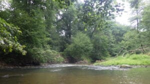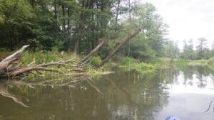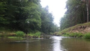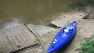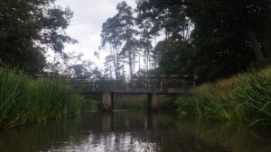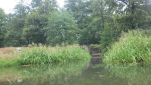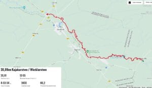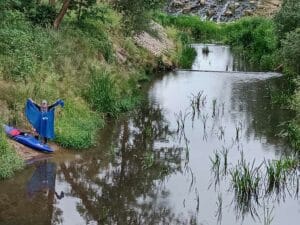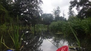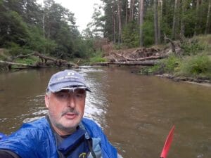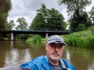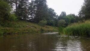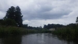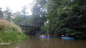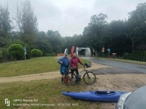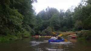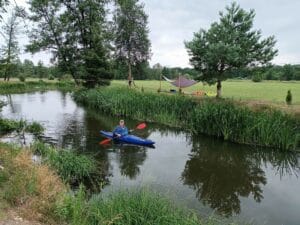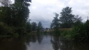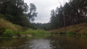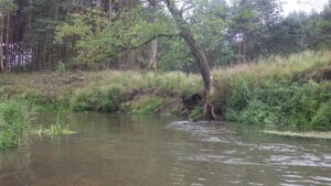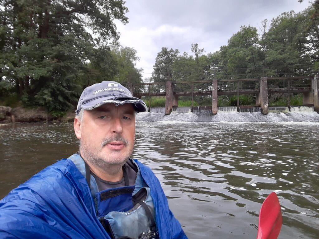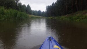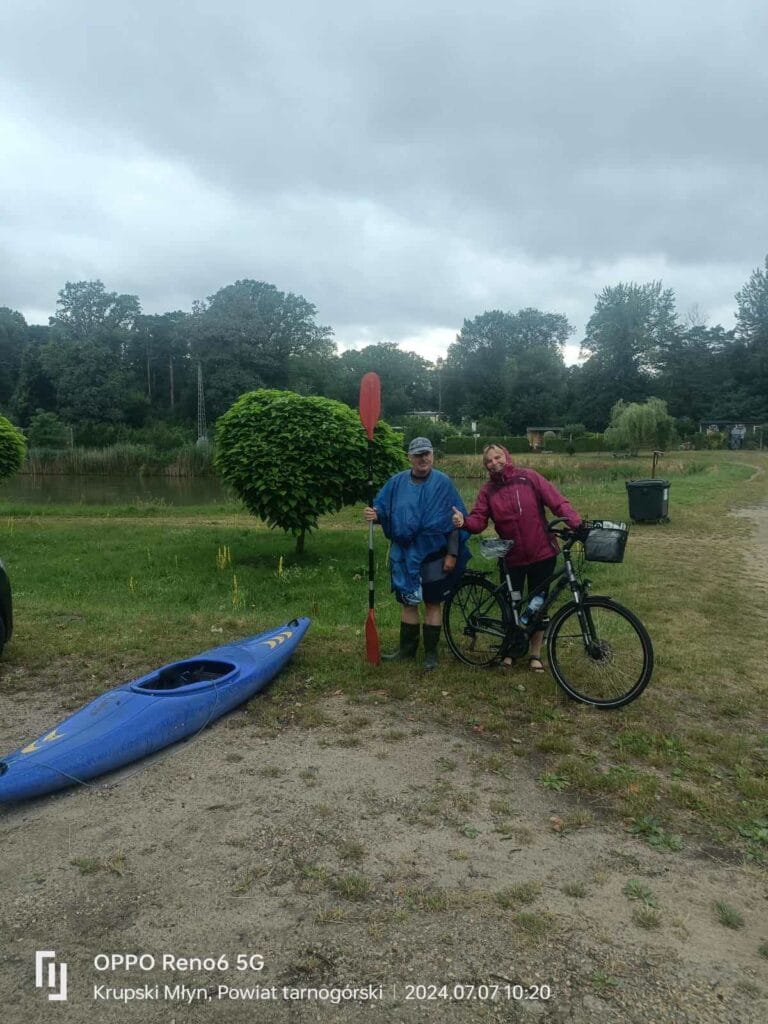 Jedziemy i o 10,30 ja ruszam na wodę, a żona na rower. Akurat zaczyna mocniej padać 🙁 . Startujemy w Krupskim Młynie.