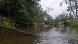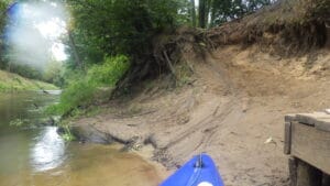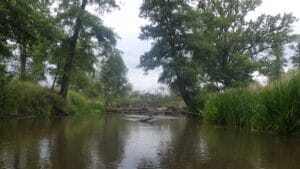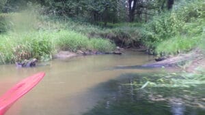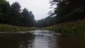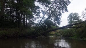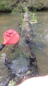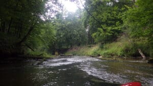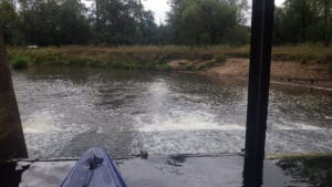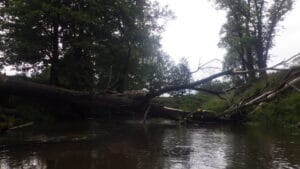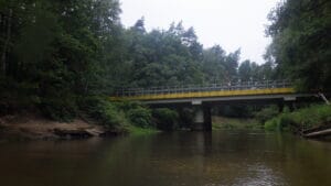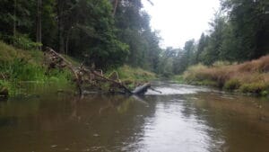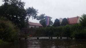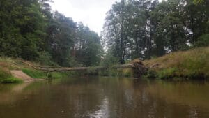 Już chwilę po starcie doganiam kajaki. To przeszkoda której obawiałem się najbardziej na dzisiejszym spływie. Wyprzedzam kilka aż w pewnym momencie zauważam kilkanaście kajaków zagradzających całą szerokość rzeki. Pomyślałem że stoją w kolejce do pokonania jakiegoś drzewa. Na szczęście , gdy byłem bliżej okazało się że czekają na wszystkich swoich kompanów, dla których na brzegu dostrzegłem jeszcze kilkanaście kajaków. Przepuścili mnie i odtąd miałem już pustą przestrzeń i płytką wodę w zasadzie tylko dla siebie. (Wodowskaz Krupski Młyn 23 cm.). Po pięciu kwadransach mijam most w Kielczy, a niespełna pół godziny później jestem przy jazie na wysokości Młyna Bombelka. Znam to miejsce dość dobrze. Mocno szumi, ale nie jest niebezpieczne do pokonania kajakiem. Upewniwszy się, że nic się nie zmieniło pod względem bezpieczeństwa, postanawiam skoczyć. Już kiedyś raz to zrobiłem mając asekurację i nawet filmik z jego pokonywania. Dziś z „okazji” niepogody zrobię to sam. Szkoda że nie miałem jak nagrać przedsięwzięcia, ale minęło kilka sekund i jestem za przeszkodą :-).