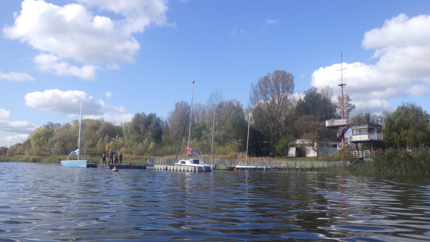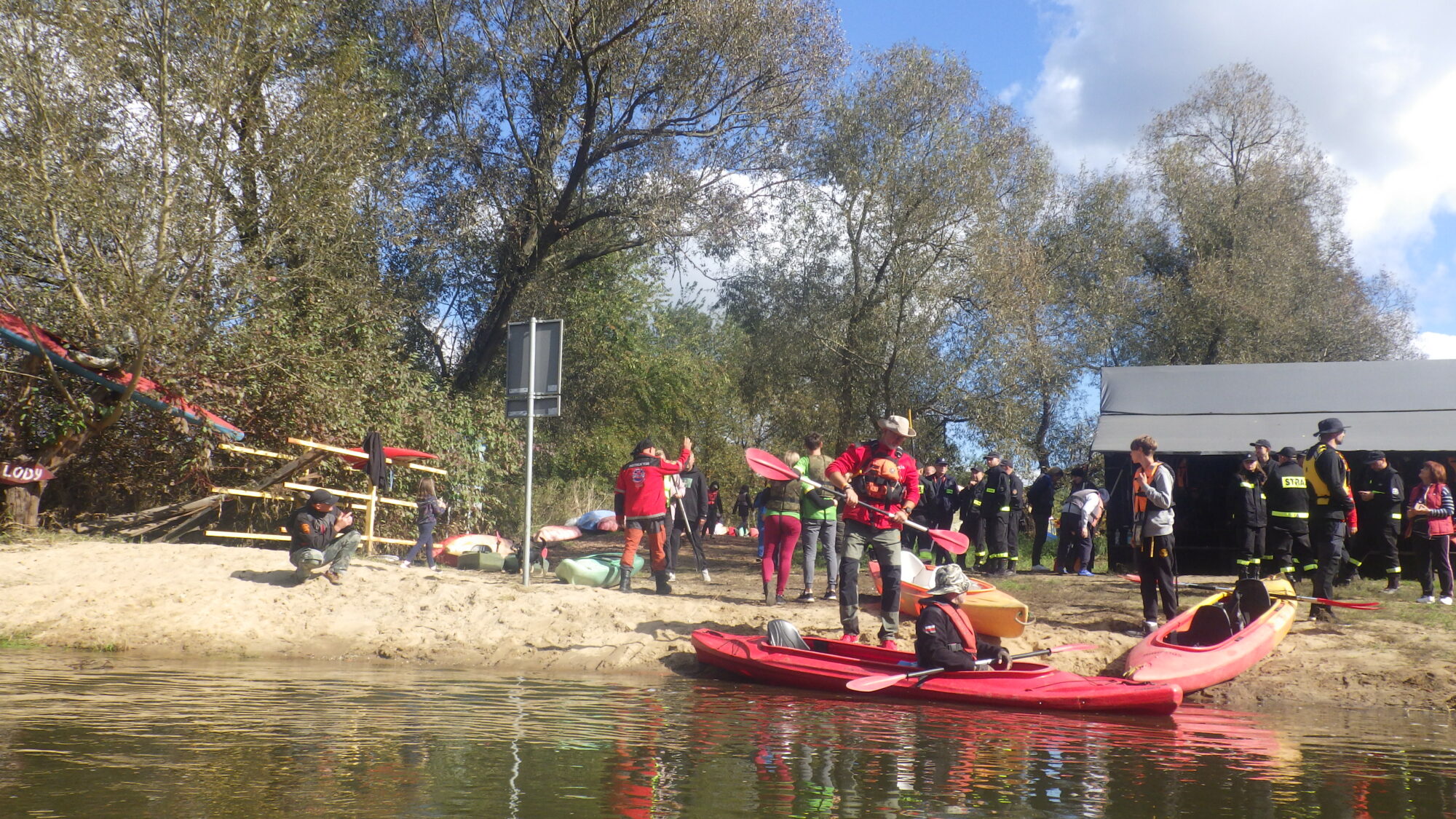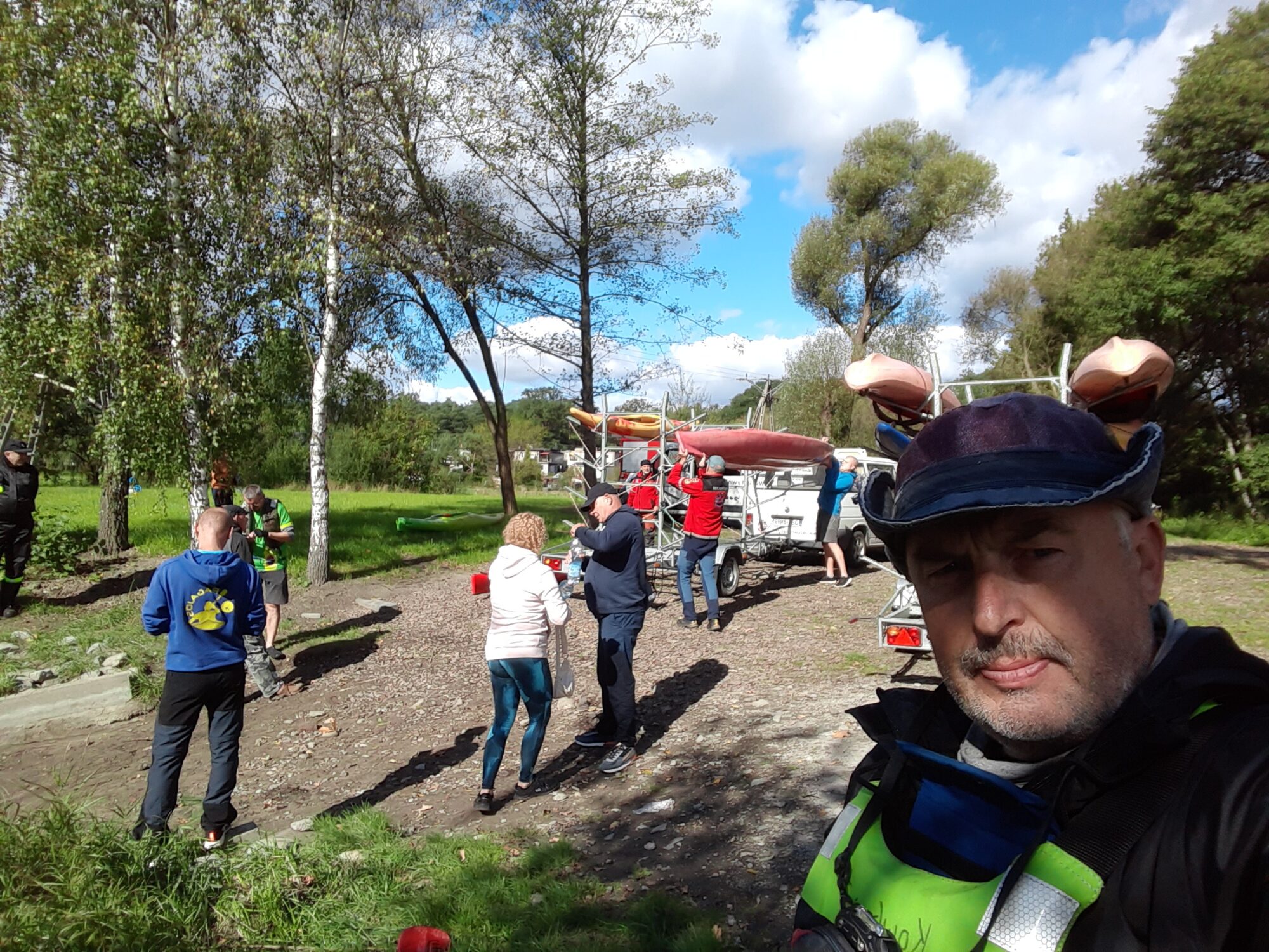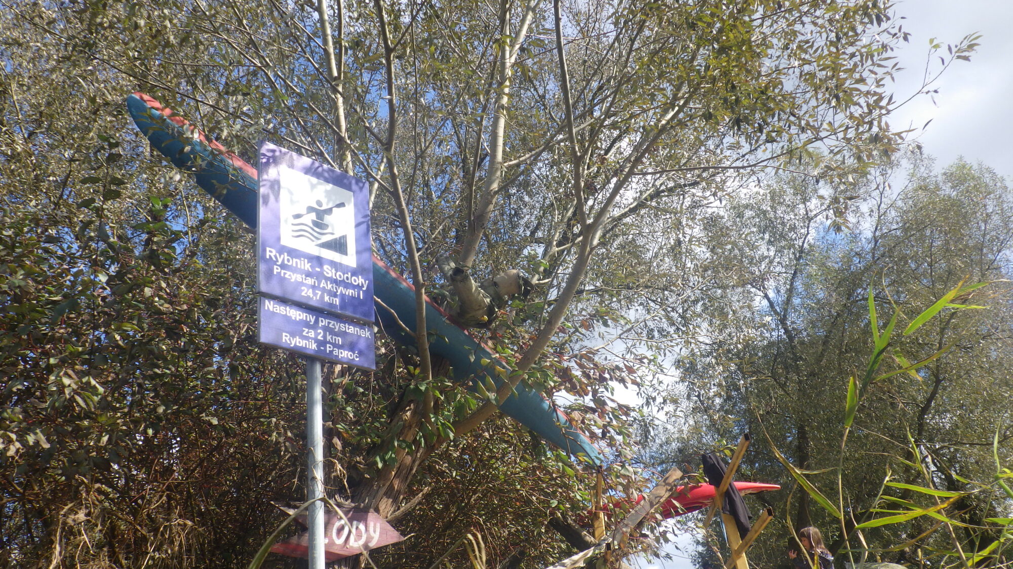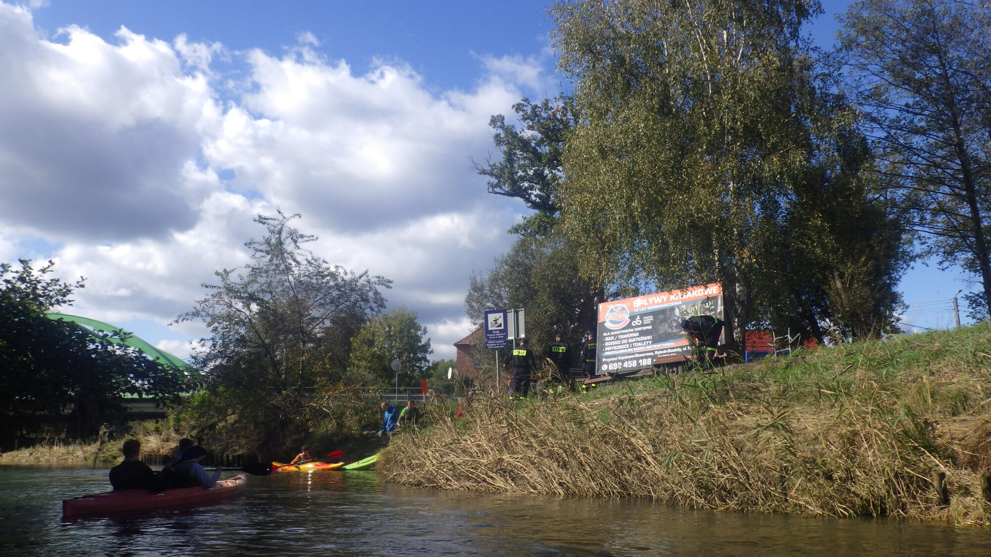 Wprawdzie na Rudzie byłem już w tym roku, ale cel i idea tego – pomocowego spływu dla mocno pokrzywdzonej w ostatniej powodzi rodziny, sprawiły, że chyba pierwszy raz w danym roku powtarzam ten sam szlak. Ale co tam – ważne by poszkodowani odczuli naszą pomoc. Na przystani Aktywnych w Rybniku Stodołach melduję się zgodnie z regulaminem pół godziny przed południem i jestem dosyć zdziwiony ilością zaparkowanych samochodów, a raczej ilością wolnych miejsc parkingowych. Widząc na „fejsie” reakcje na zapowiedź tego wydarzenia, obawiałem się że nie będzie gdzie postawić transportowca, a tu dość pusto :-(. Miałem nadzieję spotkać wielu znajomych ze starych kajakowych czasów, a tu głównie same nowe twarze. No trudno. Rozmowa z Jackiem K. – szefem Aktywnych nieco mi rozjaśnia sytuację. Otóż nagle przyszło spore ochłodzenie, nawet o ponad 10 st.C i wielu ludzi się wyłamało z kajakowania, ale w późniejszych godzinach, już po spływie powinno pojawić się więcej osób, by wziąć udział w licytacjach przeróżnych fantów przyniesionych tutaj przez darczyńców a umilanych dźwiękami duetu muzycznego „To oni”. Zbieramy się i tuż po południu schodzimy na wodę.