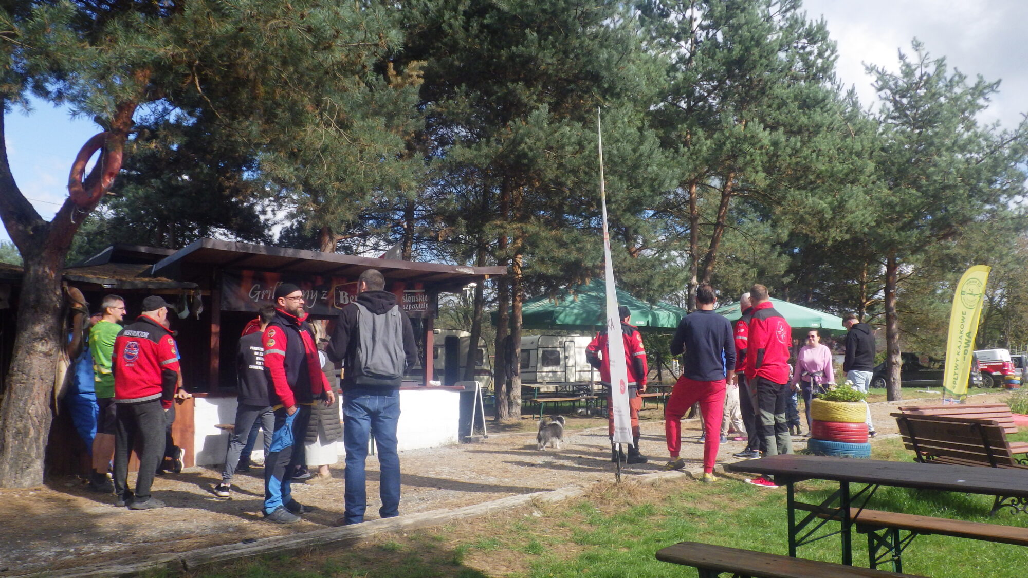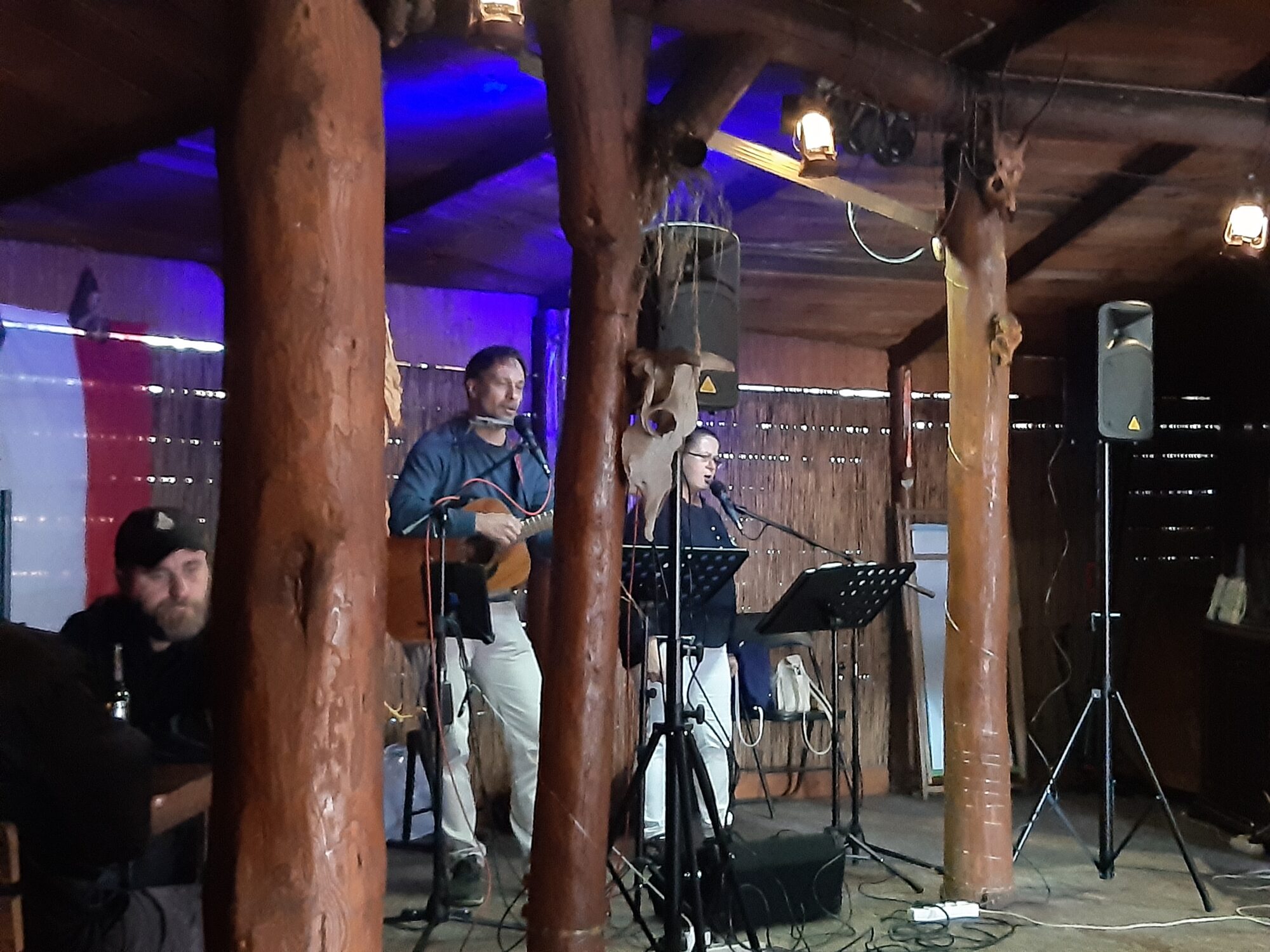 Łapię się na pierwszego busika i szybko jestem na przystani. Przebieranko , załadunek sprzętu i czekanie na kulminacyjny punkt programu. Wcześniej jednak kiełbaska na gorąco, systematyczne powroty pozostałych „śmiałków” wodnej przygody i zaczyna się. Koncert szantopodobnych kawałków a raczej wierszogrania wykonywanych przez małżeński duet „To oni” a do tego licytacja różnych przedmiotów.