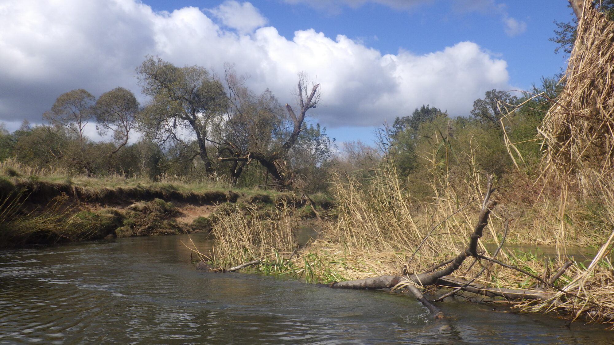Pogoda ładna, jedynie temperatura ledwo 11 st.C , ale fajnie jest. Wody w Rudzie dużo mniej niż jeszcze dwa tygodnie temu, ale więcej niż przy kwietniowym sprzątaniu rzeki i dosyć szybko płynie. (Na wodowskazie w Stodołach stan średni 104 cm.). Jest nas około czterdziestu osób. Szybko mijam początkujące dwójki i powoli, nie niepokojony przez nikogo płynąłem sobie sam do momentu dogonienia czterech jedynek z których jedną płynął pilot początkowy tego spływu. Zwalniam i trzymam tylko właściwy kurs nie chcąc wyprzedzać.