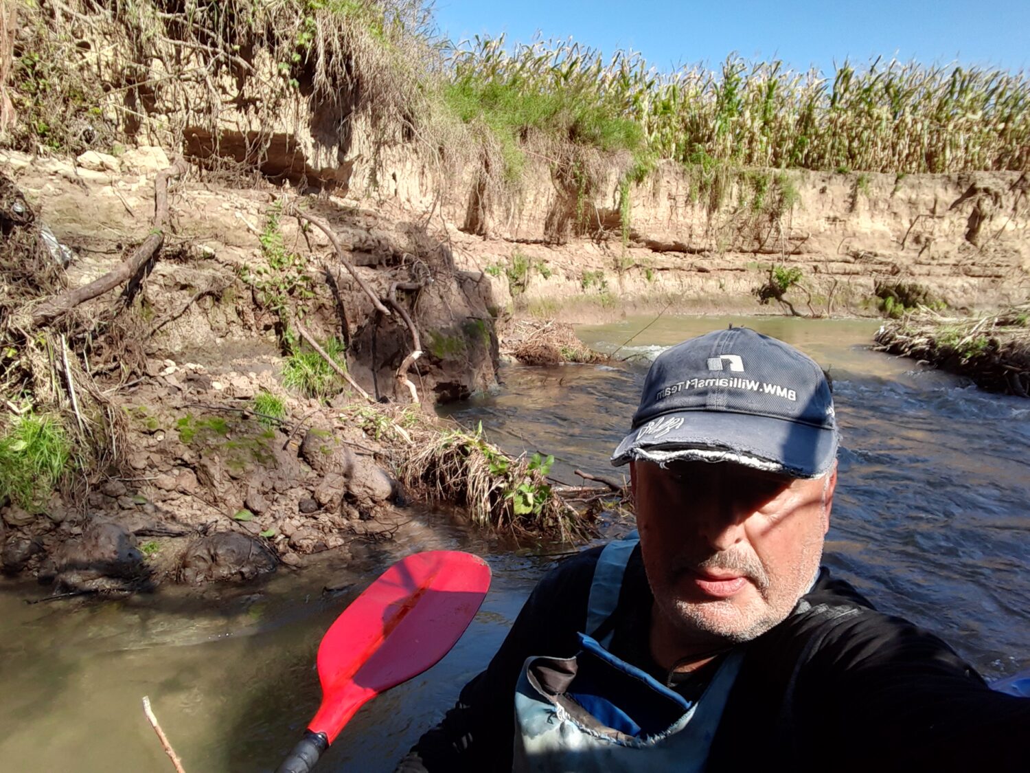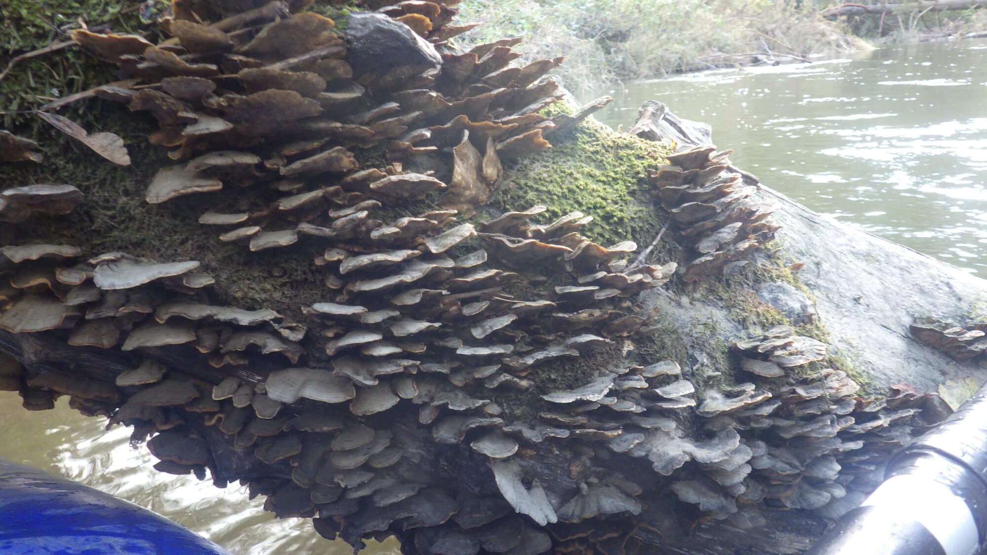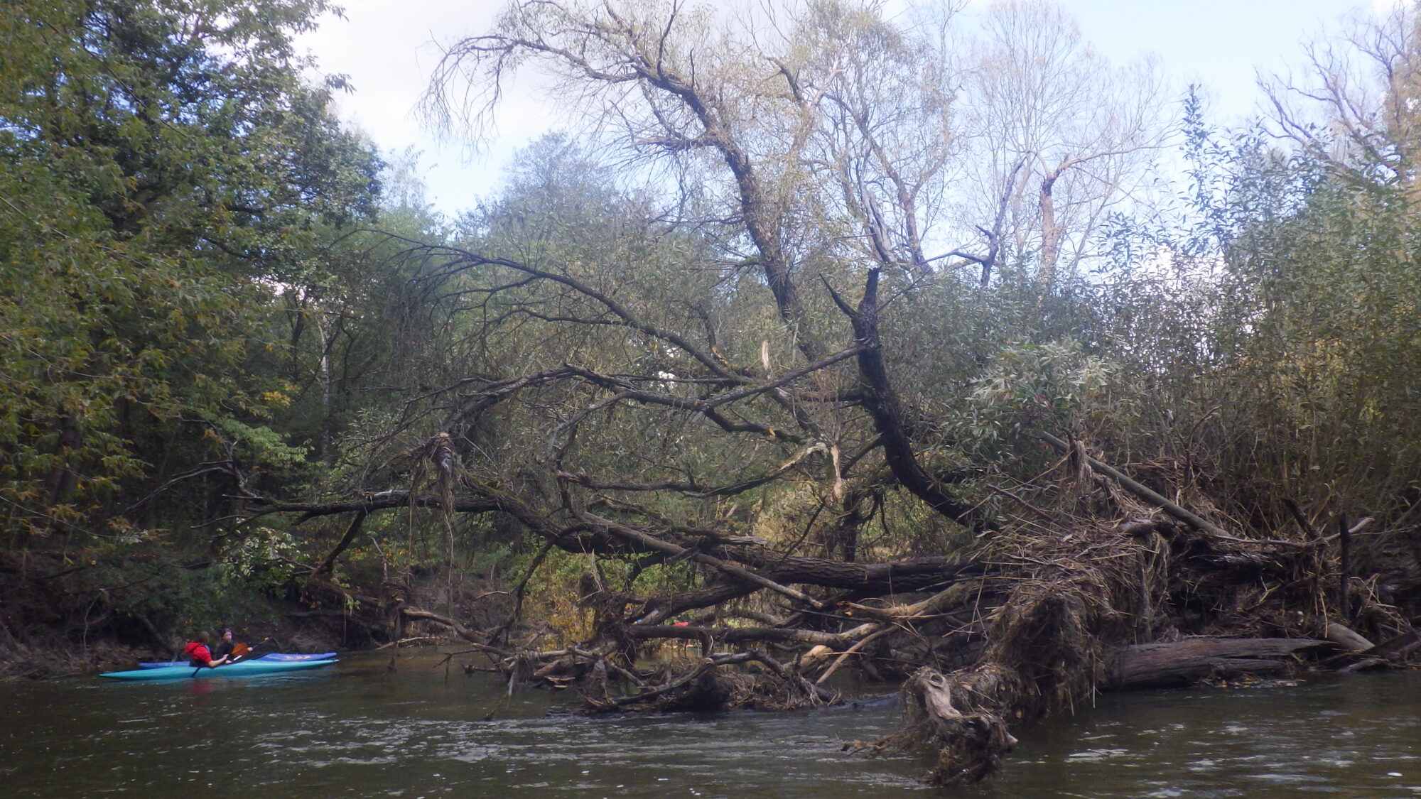 Mówią wszyscy ci którzy częściej tędy pływają, że rzeka mocno się zmieniła przez te dwa tygodnie, ja tu często nie bywam, więc wielu zmian nie widzę. Jest więcej powalonych drzew, ale organizatorzy zdążyli już udrożnić szlak tak by się nie męczyć zwałkami, są łachy piasku pokryte świeżym, płukanym żwirem no i to tyle co ja zauważyłem :-). Za jednym z zakrętów prowadzący zarządza przerwę by dogoniły nas jakieś dwójki. Kręcę się nieco pod prąd i nazad, napotykając „grzybowe drzewo” 😉