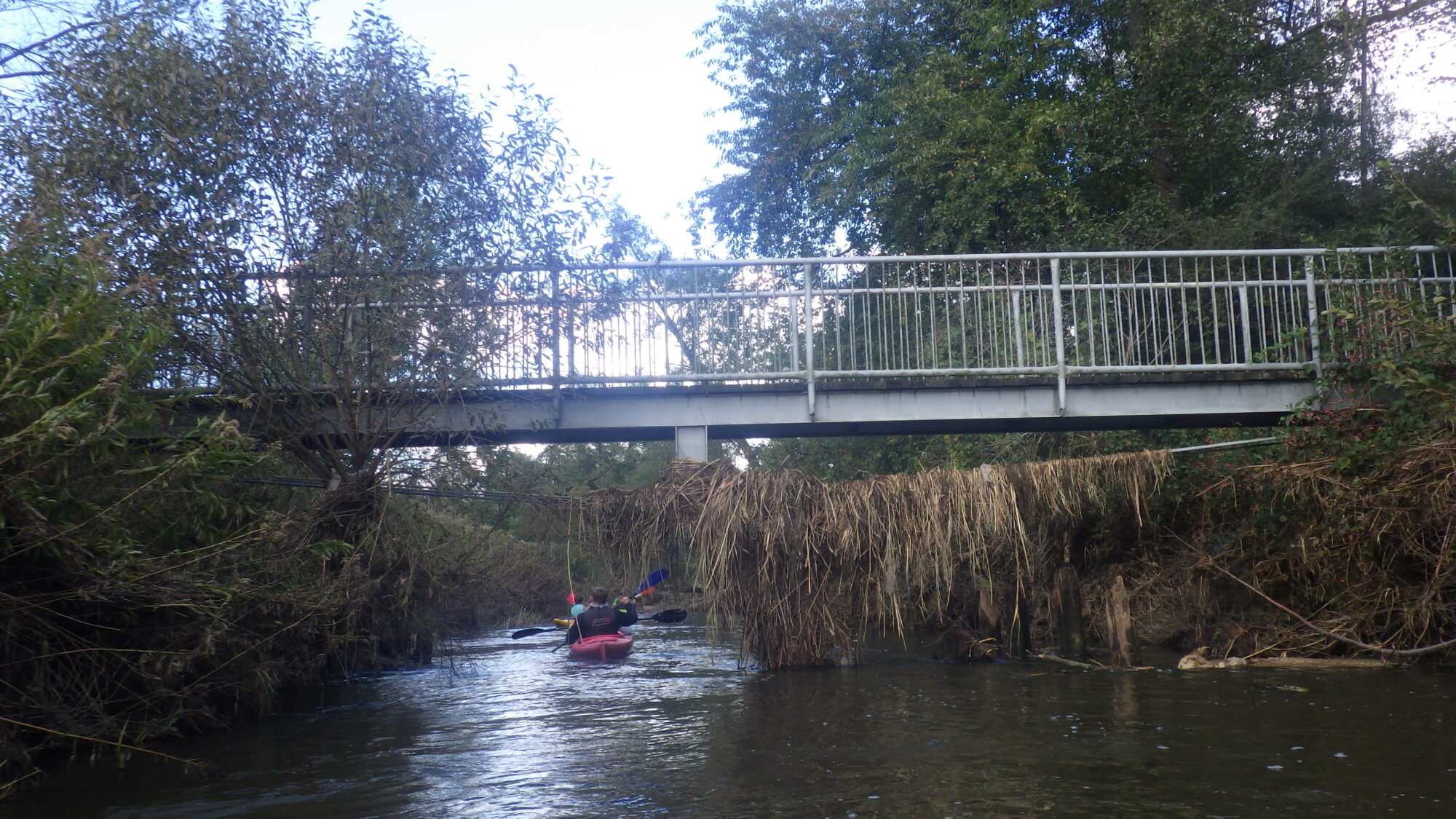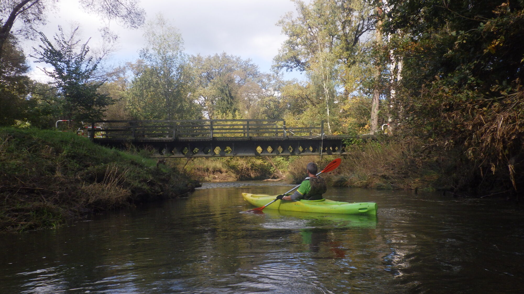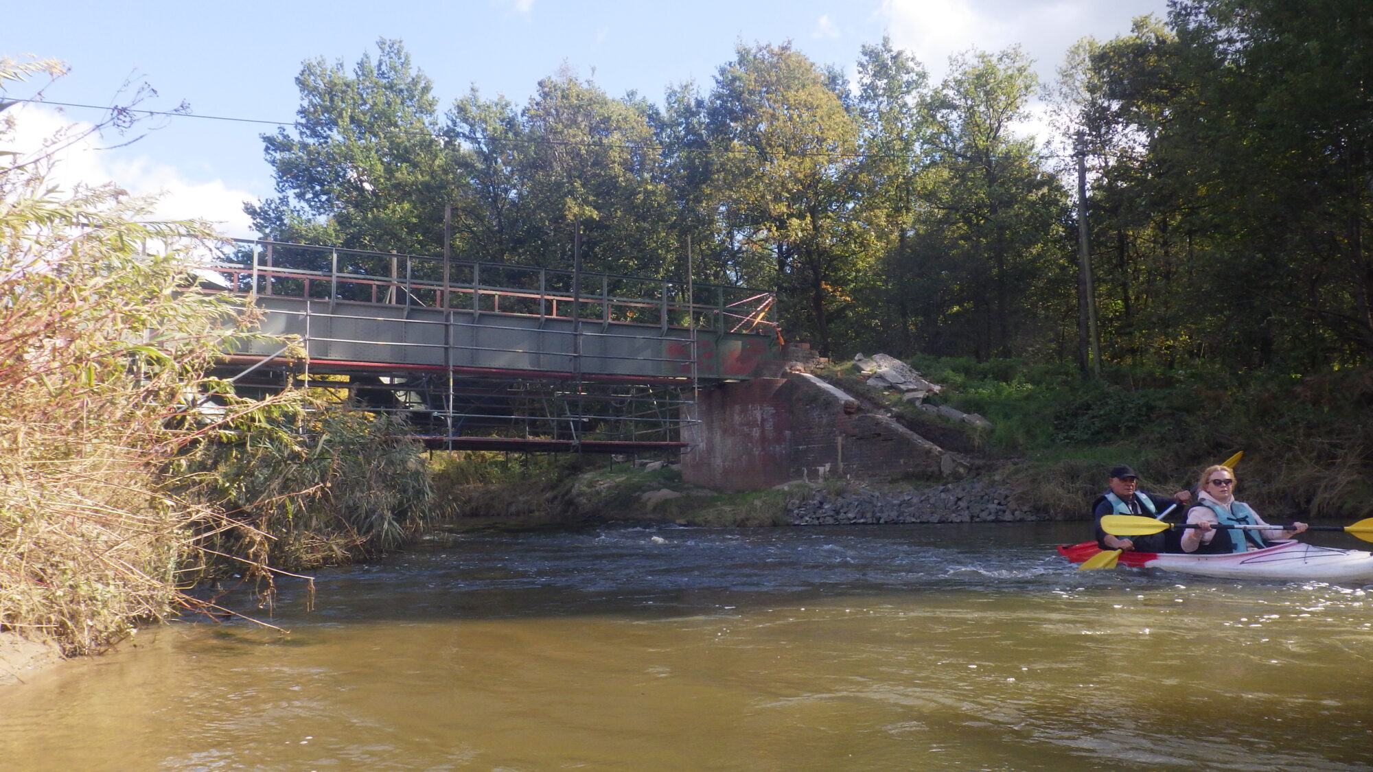 Okazuje się, że dwójki dość szybko do nas dopływają tak więc już w ciaśniejszej grupie płyniemy w stronę mety. Zapoznaję się z młodym, trzynastoletnim kajakarzem siedzącym na „ogonie” pilota początkowego, który bardzo dobrze sobie radzi z jedynką a pływa chyba dopiero od dwóch lat. Trochę sobie rozprawiamy o kajakarstwie, jak i nowych technologiach za którymi ja już nie do końca nadążam i czas i trasa mijają nam błyskawicznie. Mijamy małe bystrze pod remontowanym od niedawna mostem kolejki wąskotorowej, jeszcze kilka zakrętów i już jesteśmy w Rudach gdzie kończymy dzisiejsze pływanie. Odcinek nieco ponad siedmiokilometrowy.