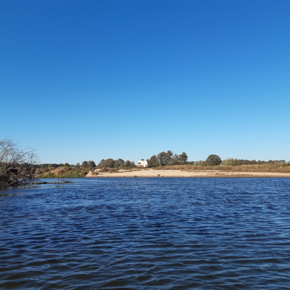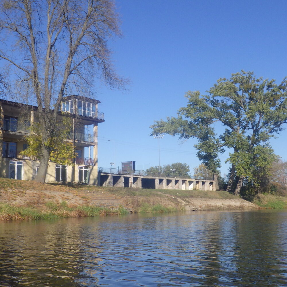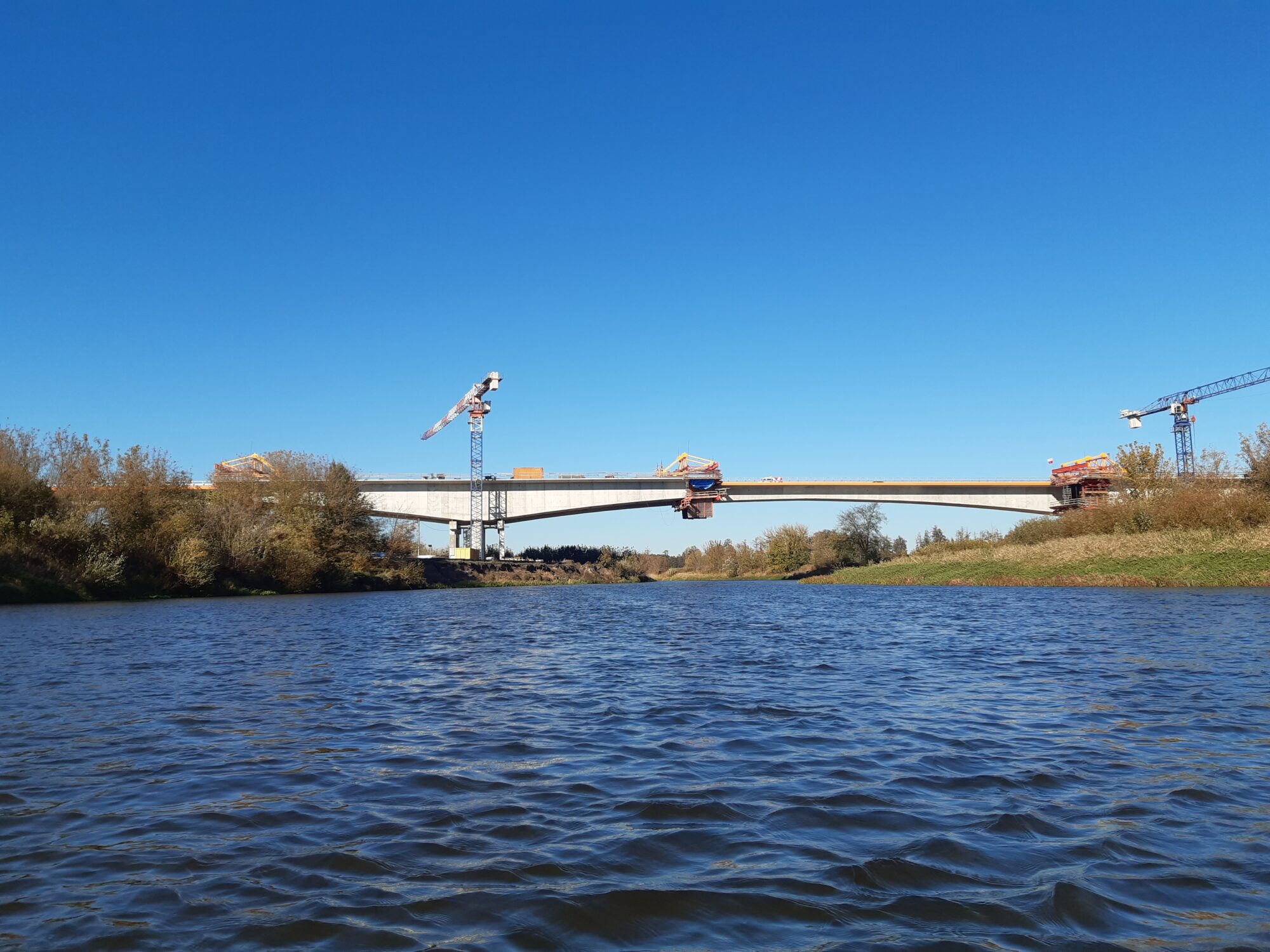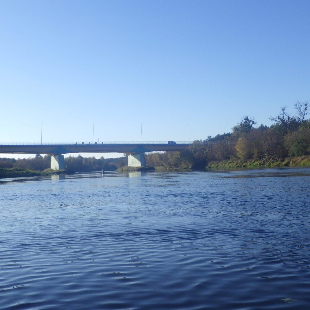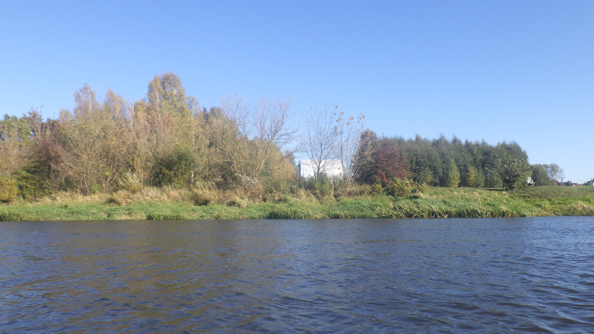 Startuję pół godziny przed południem, rzeka wygląda na szybko płynącą. Wiatr dzisiaj dość silny. Południowo wschodni, co sprawia że w większości etapu pomaga mi w płynięciu, a nie jak przez ostatnie lata – przeszkadza. Pełne słońce na niebie i temperatura około 10 st.C. Dwa zakręty i jestem pod mostem w Piątnicy za którym po prawej dostrzec można słynny zakład mleczarski o tej samej nazwie 🙂