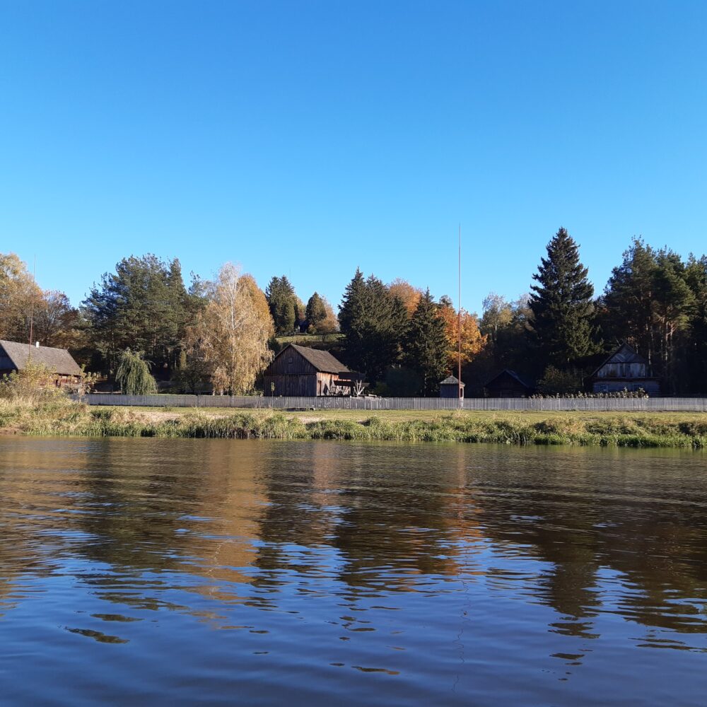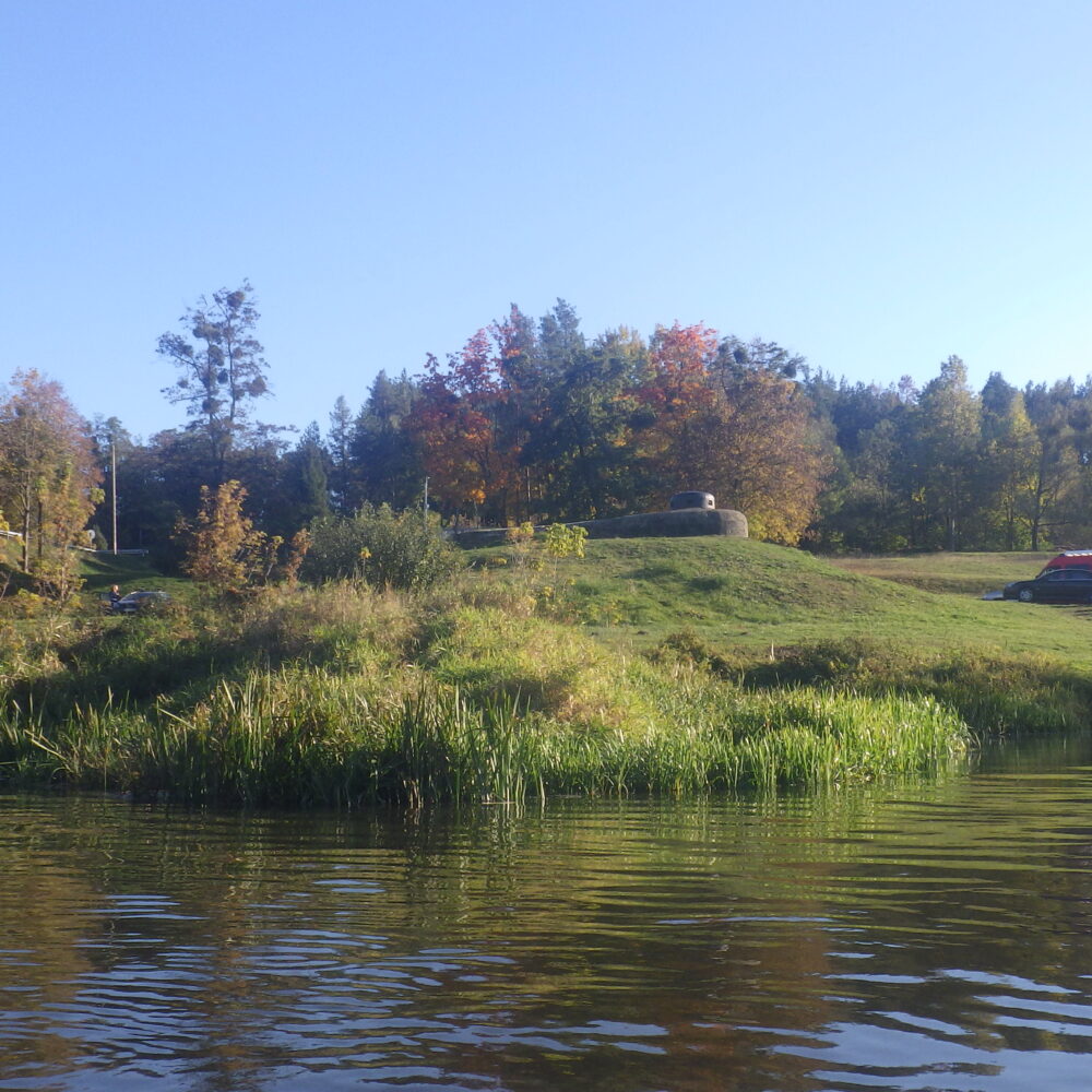 Dzięki sprzyjającym wiatrom utrzymuję tempo ośmiu kilometrów na godzinę mijając mnóstwo wędkarzy to z jednej, to z drugiej strony rzeki. Jednego nie zauważam plątając się w żyłkę. Na szczęście udaje się oswobodzić bez strat w zdrowiu i sprzęcie. Tak moim jak i wędkarza. Słońce coraz mocniej mnie oślepia, ale udaje mi się minąć ujście Lepackiej Strugi za którą pojawiają się wojenne schrony na lewym brzegu rzeki. Stąd już ledwo kawałeczek przez kamienne rafy i jest na lewym brzegu Nowogród ze swoim Kurpiowskim Skansenem naprzeciw którego do Narwi wpływa Pisa.