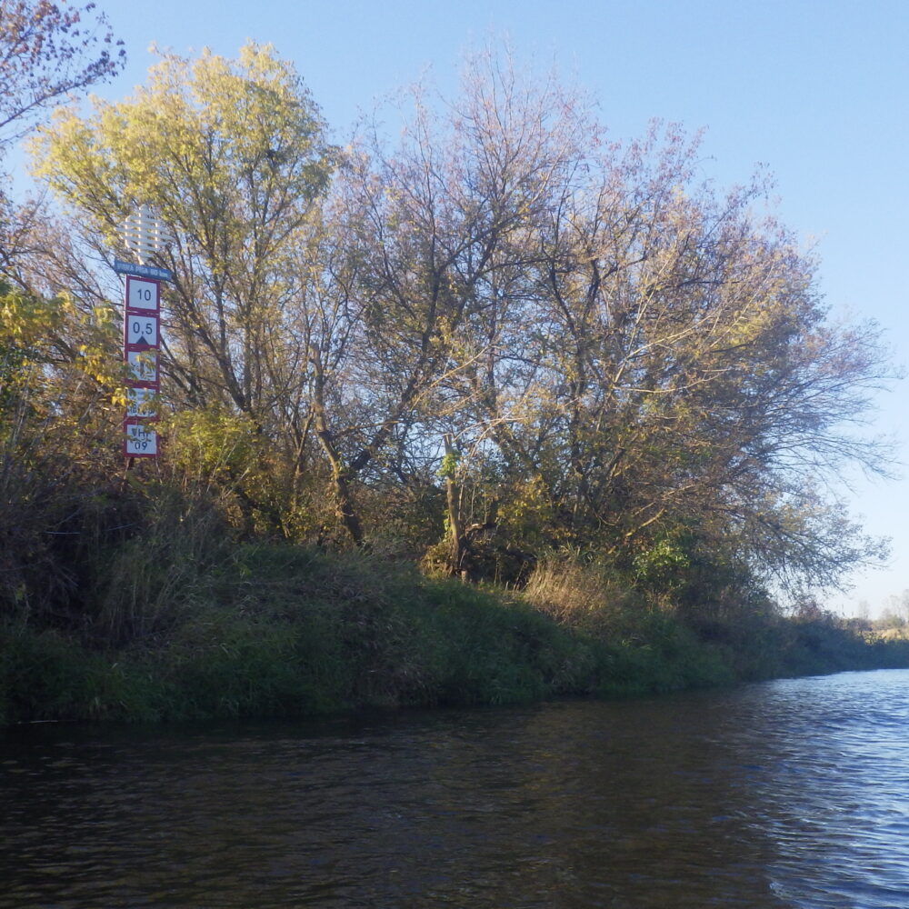 Stąd już tylko kilometr do mostu za którym przy bunkrze czeka na mnie żona z ciepłym obiadkiem. W zatoczce w której miałem zamiar skończyć dzisiejsze płynięcie odbywają się jakieś manewry straży pożarnej, wracam zatem pod most kończąc obok wodowskazu wskazującego dzisiaj 44 cm. (Wodowskaz Łomża/Piątnica 91 cm.) To był udany kawałeczek dnia.