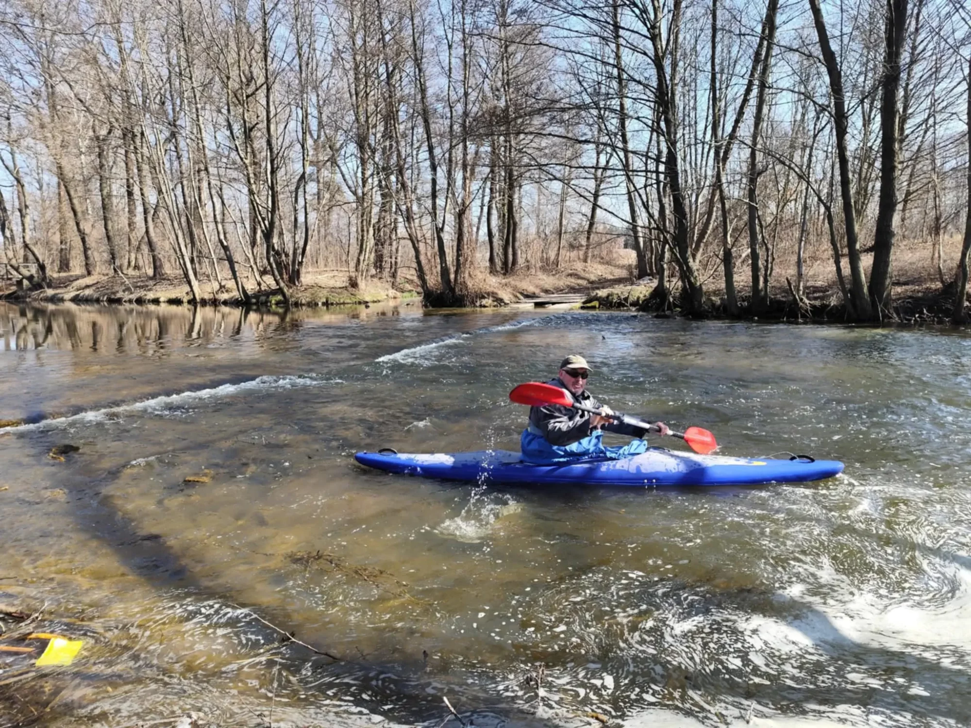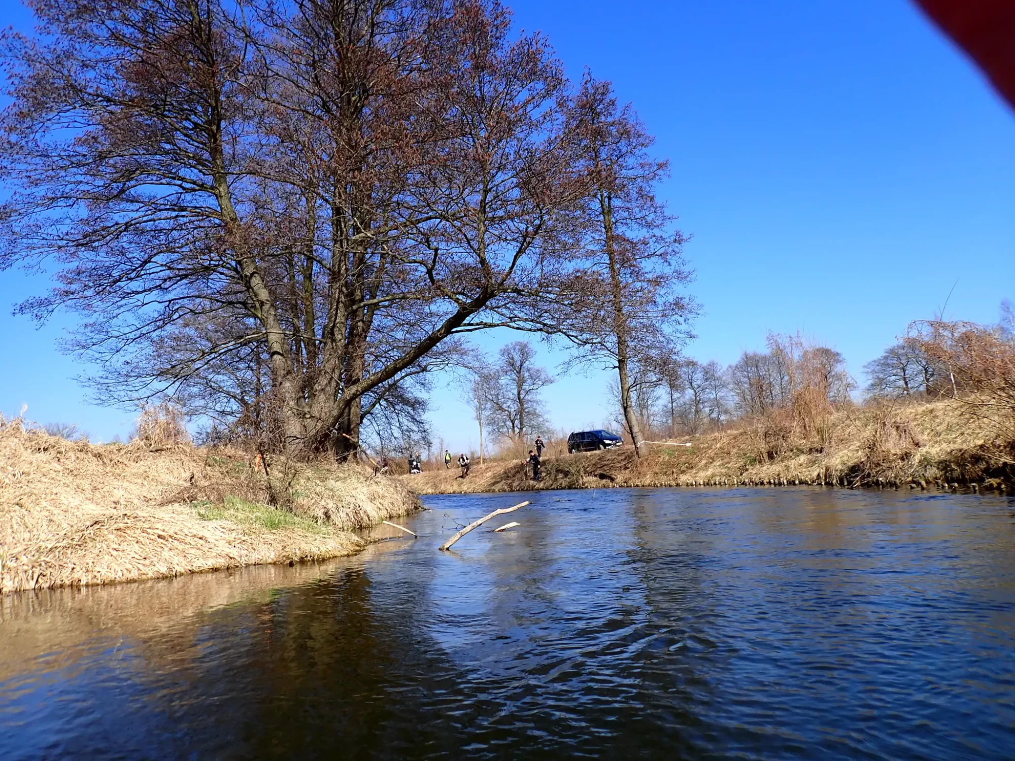 Czegóż się spodziewać po rzeczce po której pływało się już kilkadziesiąt razy, byle do mety i dzień nie na straty ;-). A tu nie, już po stu metrach na brzegu kupka ciuchów obok stojącej, przyodzianej w raczej cieplutkie ubranko, dziewczyny i przebłysk gołej męskiej dupy, szybko ginącej za krzakami :-). Jakiś, mors – naturysta czy cóś? Zawstydzony uciekł przede mną, a jeszcze nie miałem nawet aparatu w ręce 🙂 . Przepływam kolejne pięćset metrów i znowu przygodowo, tym razem ja będę musiał uciekać 😉 . Za mostem na ulicy Zarzecznej w Przeczycach, lewy brzeg oblężony przez wędkarzy – zawodowców 😉 . Uszy mnie aż bolą od różnych epitetów, jest nawet groźba prawie karalna i dowiaduję się że rzeka zamknięta. Kurcze, a ja nic o tym nie wiem? 🙂 . No i ta sytuacja ciągnie się na dystansie trzech kilometrów i mimo że kilku zawodników wyciąga przy mnie ładne rybki , to obopólne napięcie wyczuwa się w powietrzu, i tak aż do momentu w którym widzę flagę kończącą obszar zamknięty. Uff. Chcę się upewnić czy rzeczywiście koniec zawodów, pytam zatem filmujących mnie gości a ci nic, obrażeni czy co? Będąc bliżej widzę, że to jacyś skośnoocy, może Japończycy? Nie dogadamy się, ale miałem rację, koniec zawodów. Tyle przygód na pierwszych pięciu kilometrach podczas których do pokonania miałem jedno drzewo i jeden prożek 🙂
