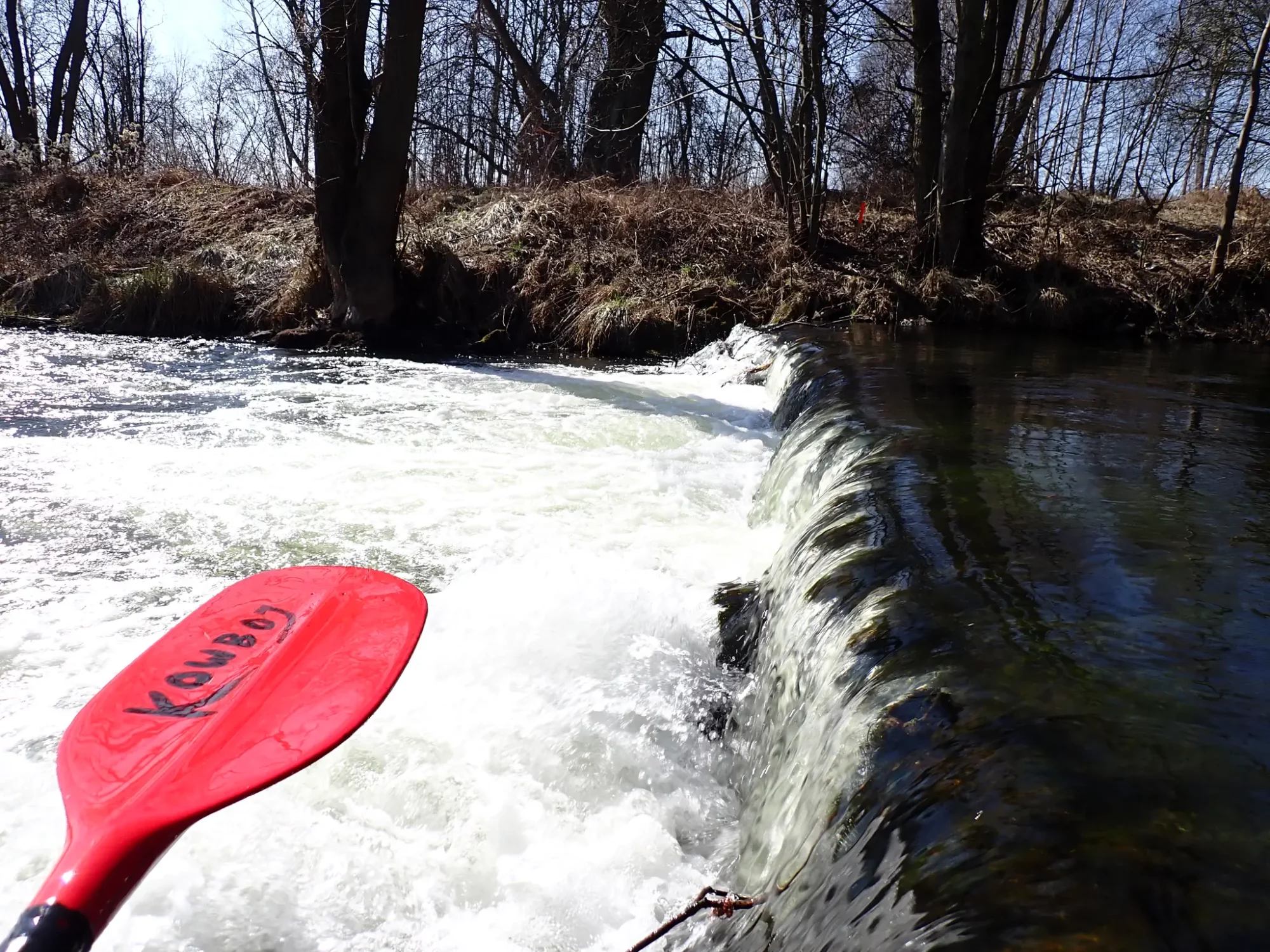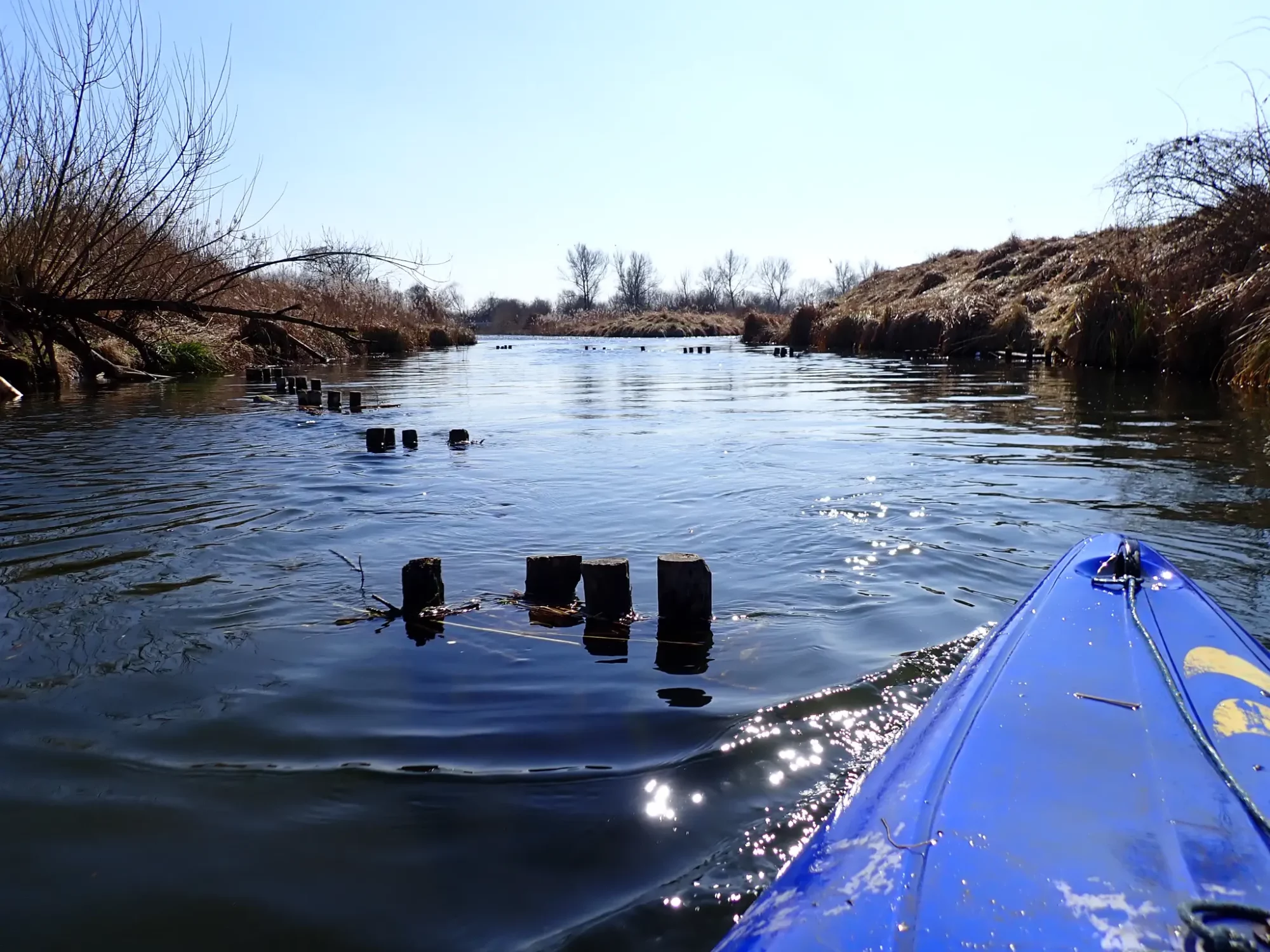 Skoro teraz już bezstresowo, próbuję znaleźć jakieś plusy pływania po niskiej wodzie (wodowskaz Przeczyce 62 cm.) No i znajduję. Dzisiejsza woda jest około dziesięć centymetrów niższa niż ta po jakiej pływałem tu w ubiegłym roku, dzięki czemu wszystkie sztucznie powbijane w poprzek rzeki kołki, wystają nad lustro wody, przez co nie ma problemu w manewrowaniu pomiędzy nimi. W ubiegłym roku nie było ich prawie w ogóle widać, przez co często o nie zahaczałem :-(. Mam wrażenie że z każdym rokiem jest tych kołków coraz więcej bo praktycznie od startu. Miałem nawet zapytać wędkujących czy to ich robota i w jakim celu, ale atmosfera nie pozwoliła mi na taki akt odwagi. Kołki napotkać można aż do rozwidlenia rzeki z kanałem Przemszy.