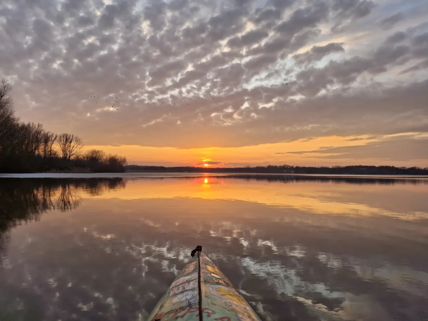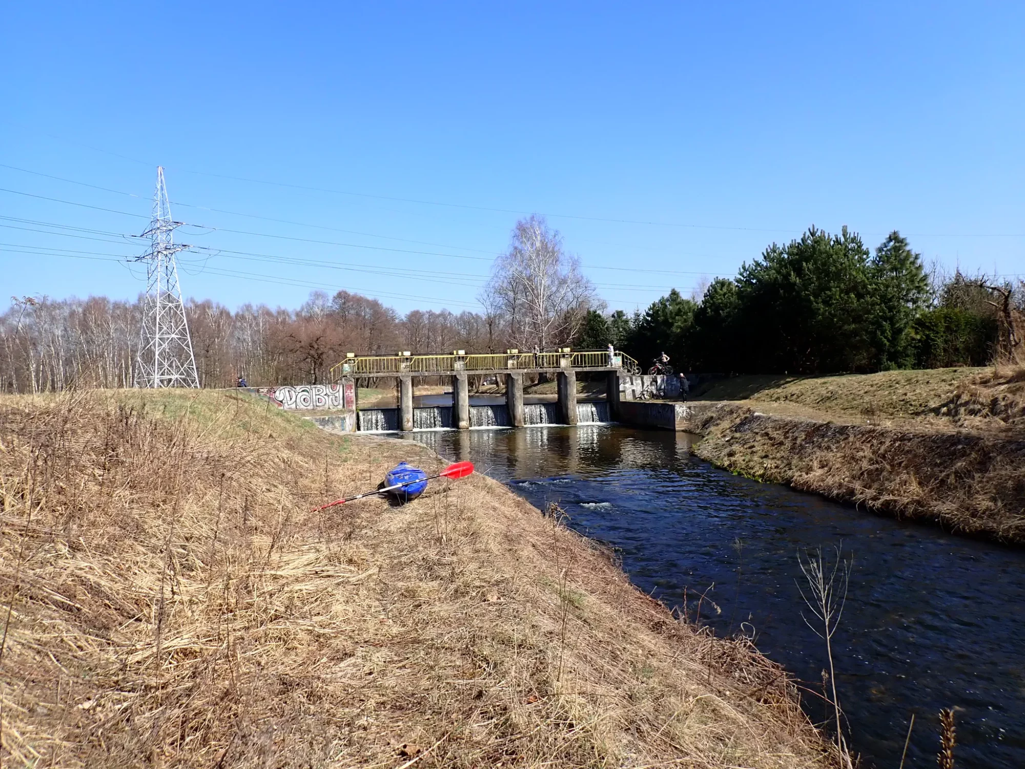 Na dziesiątym kilometrze mijam kanał odpływowy z Pogorii 4 i teraz już tylko wiosłowanie ku trzem zastawkom wymagających obnoszenia. Pierwsza już po kilometrze. Obok Parku Zielona.