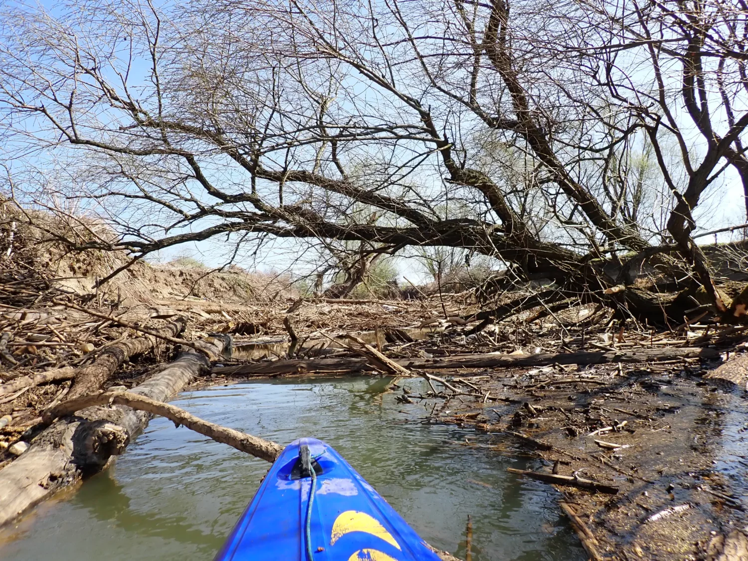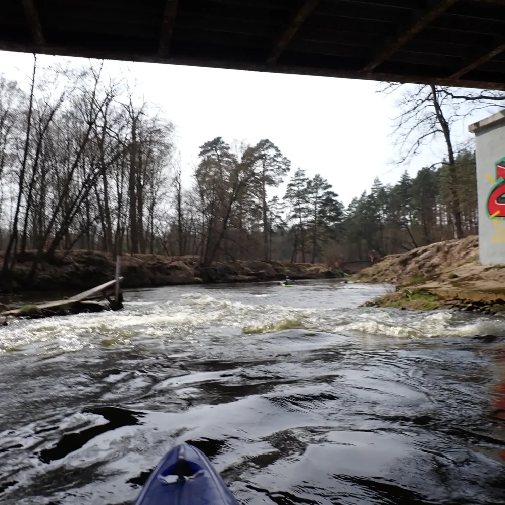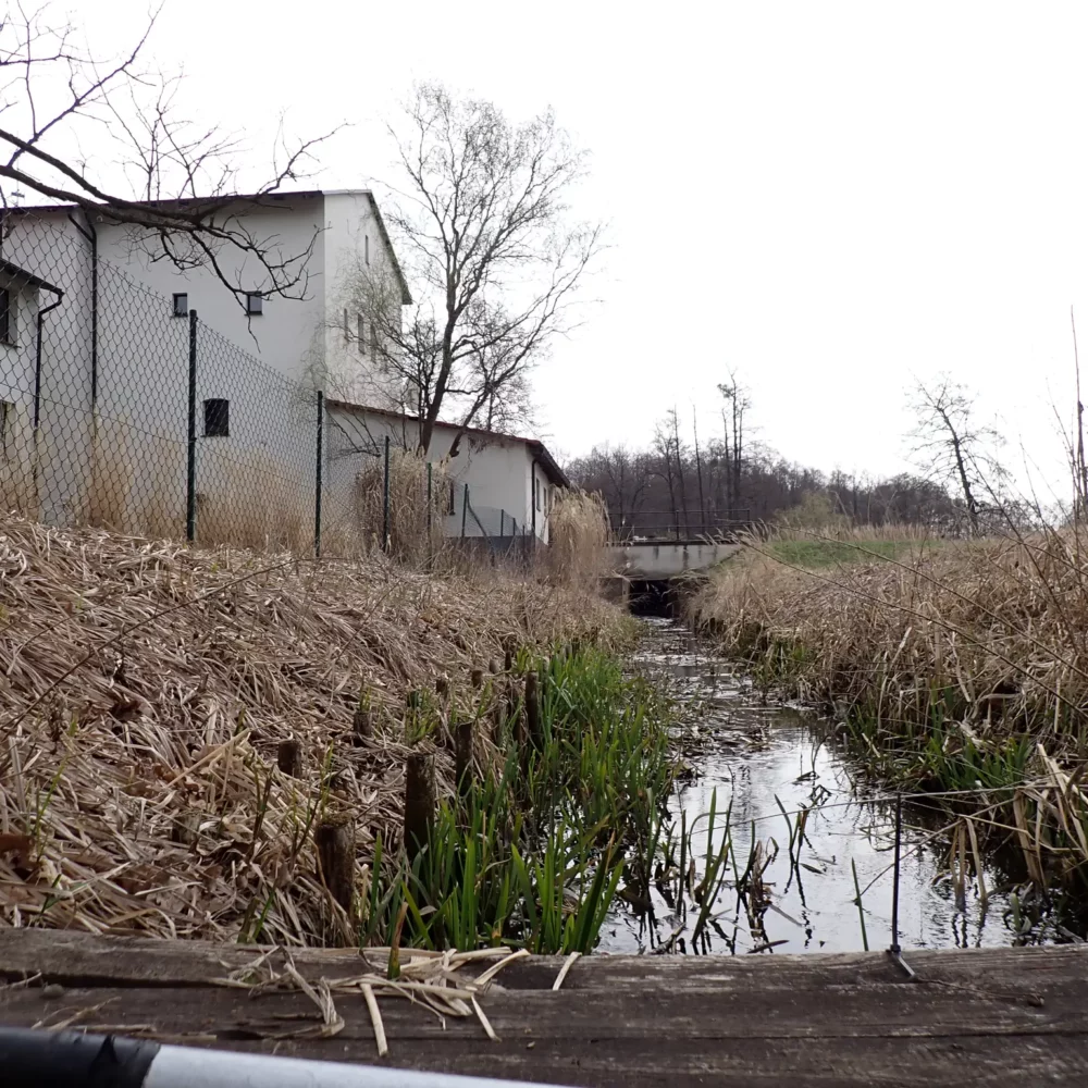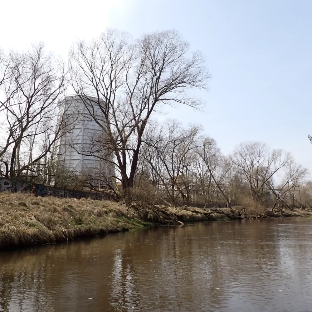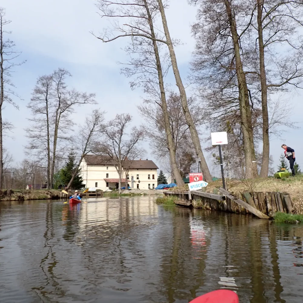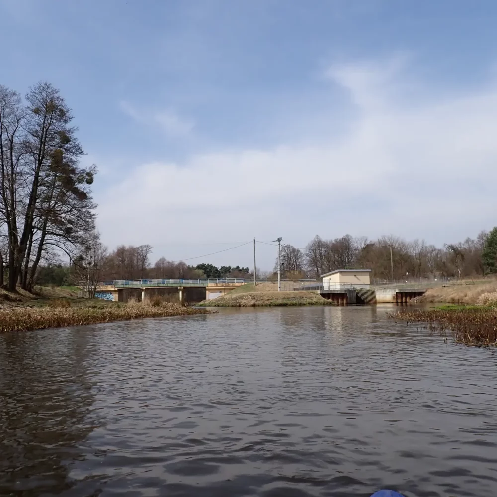 Jest chłodno więc bez obijania się wiosłuję nie oglądając się na nikogo. Mam pomysł by poznać z kajaka pobliski Kanał Hutniczy, jednak po dopłynięciu do młynówki kanału Bombelka, w który wszyscy wpłyną by zakończyć spływ, ja płynę dalej odbijając obok jazu w lewą odnogę, która doprowadza mnie do drugiego jazu z którego skok kończy się tym że jestem nieco zmoczony.