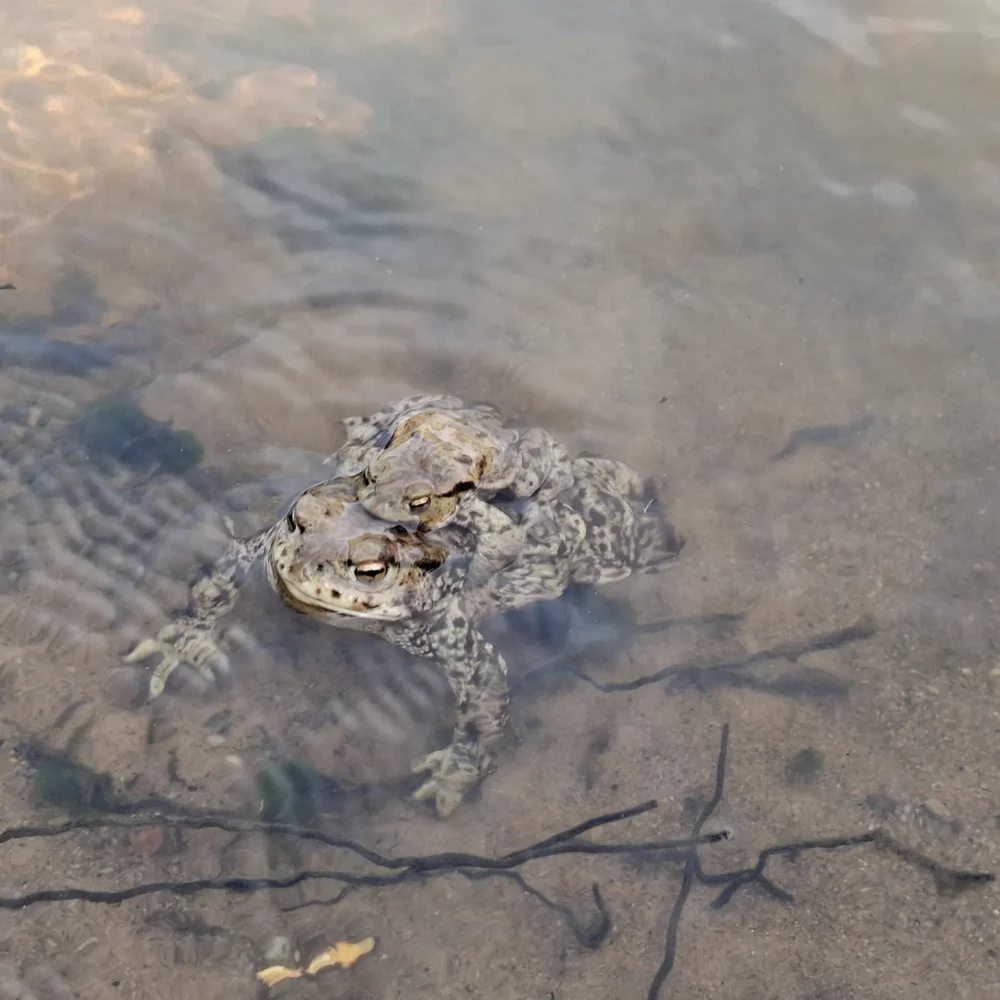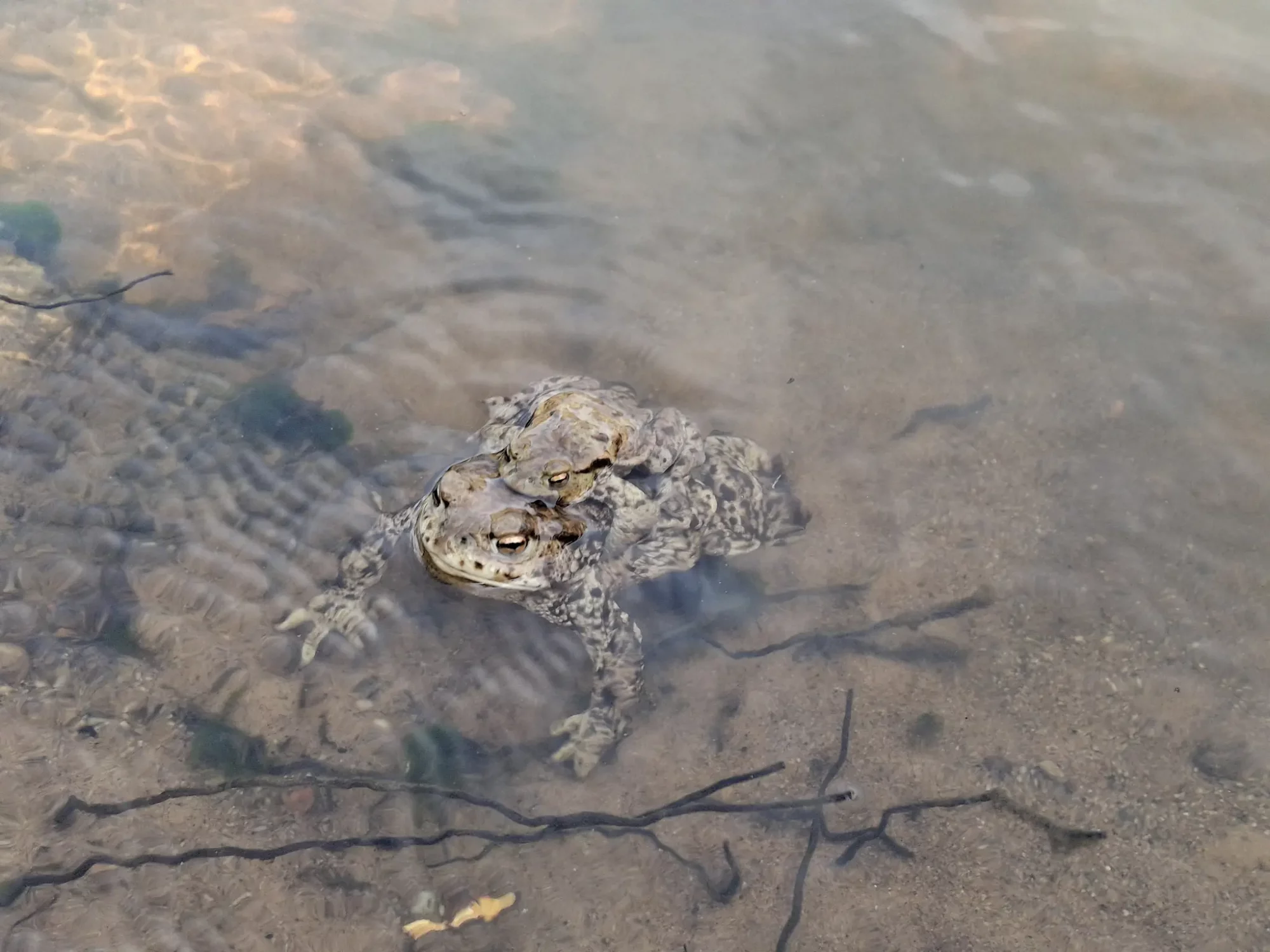 Dalej przenoszenie przez jaz na ulicy Kilińskiego w Zawadzkich. Tutaj krótka przerwa podczas której obserwuję żabie gody. Na wielkiej ropusze siedzi mały „żabek” spychany przez innego. Trzyma się jednak mocno i nie odpuszcza.