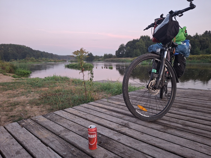 Udało się odespać kilka zarwanych godzin, budzik nastawiony na ósmą a tu nie przewidywana sytuacja. Słyszę że kapie deszcz :-(. Wyglądam na zewnątrz, niebo calutkie pokryte ciemnymi chmurami. Kiepsko. Ogarniam się trochę w namiocie i deszcz ustaje. Wykorzystuję tą chwilę na szybkie zwinięcie obozowiska i ruszam w stronę ostatniego mostu nad Pilicą. Zaczyna znowu kropić. Postanawiam podjechać do skansenu militarnego w Mniszewie. Na wejście jeszcze zbyt wcześnie no i kropi 🙁 . Kilka zdjęć czołgu przed wejściem i wracam na szlak wzdłuż Pilicy mijając różne historyczne budowle i pomniki. Jest kopiec Kościuszki w Rozniszewie dalej obelisk poświęcony „ŻOŁNIERZOM 8 PUŁKU 3 DYWIZJI PIECHOTY IM. ROMUALDA TRAUGUTTA 1 ARMII WOJSKA POLSKIEGO…” w lesie mogiła nieznanego żołnierza poległego w sierpniu 1944 roku i tutaj deszcz nasila się. Chwilę stoję pod drzewem, ale zaczyna przeciekać, ruszam w drogę licząc na jakieś schronienie i trafiam na wiejski przystanek. Spędzam pod daszkiem sporo ponad godzinę. Prognozy mówią że będzie się wypogadzać i rzeczywiście prawie dokładnie według prognoz tak się dzieje. Ruszam mijając Warkę oddaloną około kilometr po drugiej stronie Pilicy. Przed piętnastą już w słoneczku docieram do ośrodka Emaus w miejscowości Turno na przedmieściach Białobrzegów. Znam go od strony rzeki. Ładnie położony nad samym jej brzegiem. W Białobrzegach na Placu Zygmunta Starego posilam się kebabem na ławeczce obok Jeremiego Przybory i jadę dalej. Przed mostem teren spacerowo rowerowy z napisem Białobrzegi. Znów podobieństwo z Kanadą. Tam robiliśmy fotki pod nazwami miast w wielu miejscach. Przejeżdżam na lewy brzeg Pilicy (dla mnie prawy) i mijam z daleka pałac rodziny Świdzińskich w Świdnie i wjeżdżam w Rezerwat Przyrody Tomczyce. Króciutko przez las i przed dziewiętnastą mijam Pałac Granowskich w Nowym Mieście nad Pilicą ( budynek remontowany). Jeszcze pół godzinki i wjeżdżam na przystań w Domaniewicach położoną tuż obok promu rzecznego i Prom Baru ” otwartego tylko w łykendy” ;-). Nad wodą ruch. Stoi autokar i dwa auta z przyczepami na których naliczyłem 31 kajaków dwuosobowych. Na szczęście kończą się zwijać i tuż przed zmrokiem jestem sam. Rozbijam namiot i idę lulu. Księżyc dziś mocno oświetla mi obozowisko. Za trzy dni będzie pełnia. Przejechałem 92 kilometry.