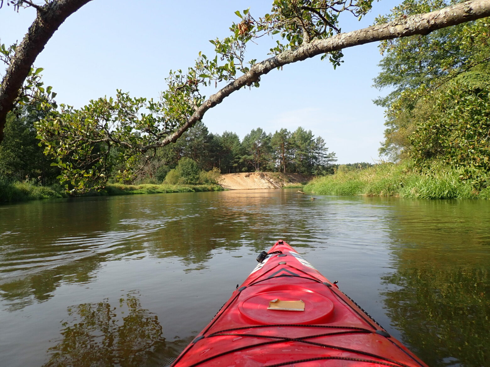 Po zażyciu niewątpliwej dawki adrenaliny ;-), ruszam dalej na spokojne i płytkie zarazem wody Pilicy. Wodowskaz w Przedborzu (około dwadzieścia kilometrów wcześniej) pokazuje dzisiaj 187 cm. Na wodzie dosyć pusto, środek tygodnia i już po wakacjach. Około półmetka mijam grupkę która razem ze mną została przywieziona na start, ale przez moją „małpią przygodę” troszkę mnie wyprzedzili. Teraz wyprzedzam ich ja i w samo południe mijam ujście Czarnej Koneckiej (Malenieckiej) licząc że może teraz będzie nieco łatwiej wiosłować.