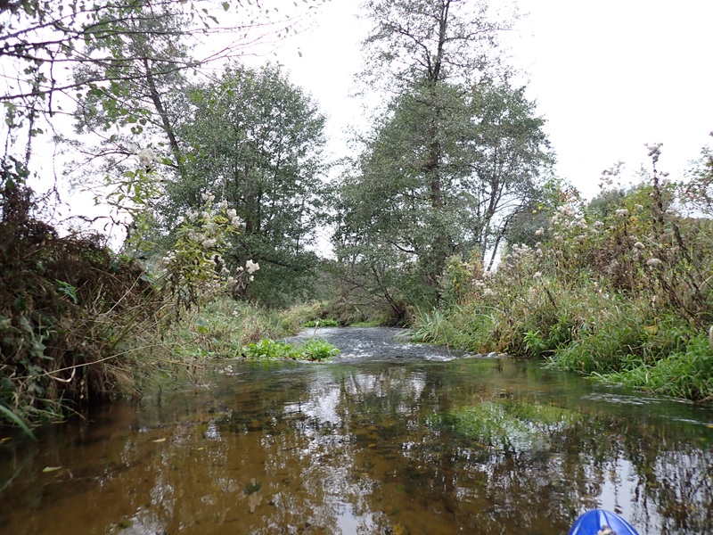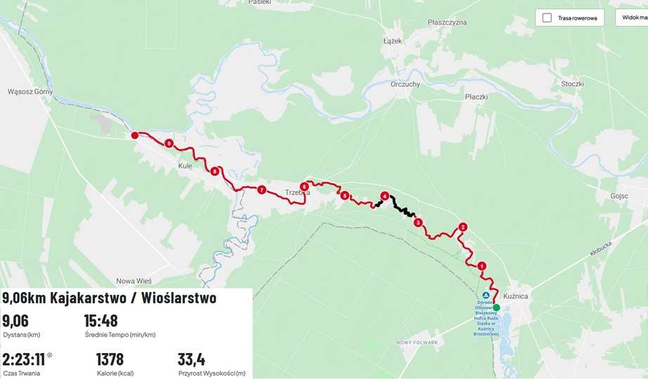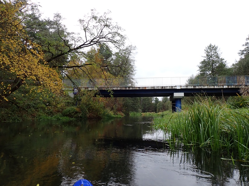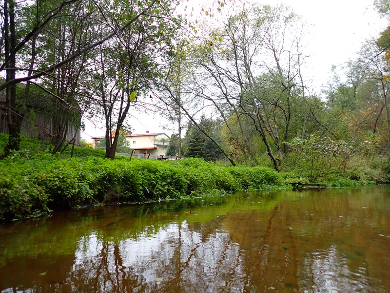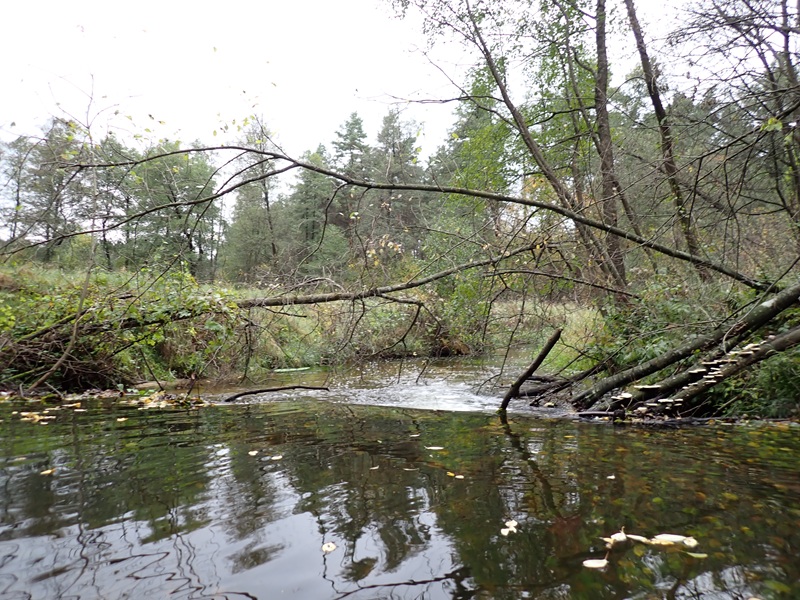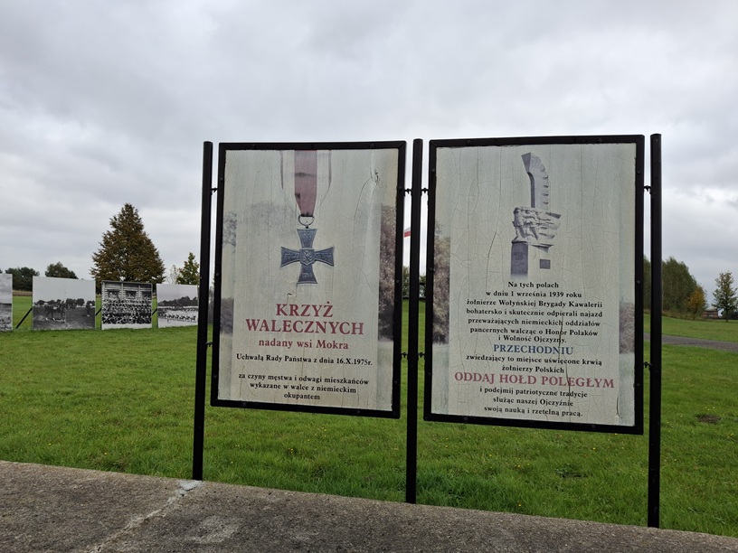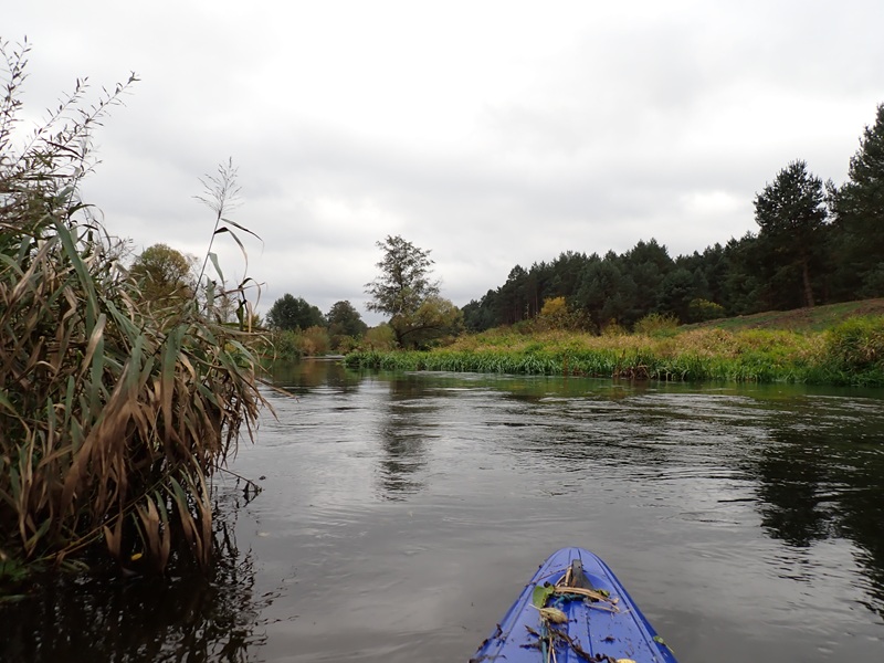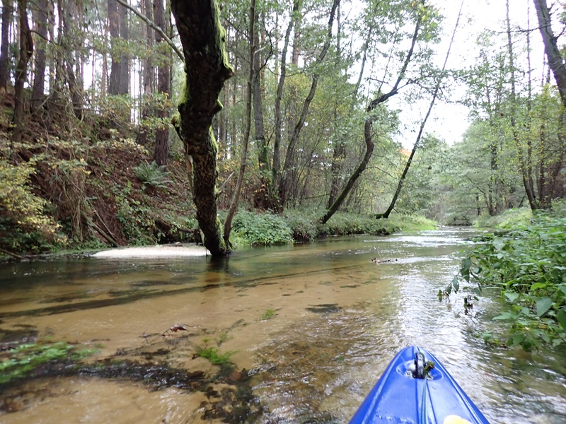 Po wczorajszym demokratycznym 😉 głosowaniu okazało się, że w niedzielę odbędą się dwa oddzielne spływy. Część ludzi przypłynie do naszej bazy w Kulach Wartą, a druga część, ta w której jestem ja i sześcioro innych śmiałków na jedynkach, również do Kul, ale poprzez Kocinkę, Liswartę i ponad sto metrów Warty. No to Liswartę (1,8 km.) za ujściem Kocinki przepłynę w tym roku drugi raz, a te ponad sto metrów Warty już nawet po raz trzeci :-). Na start do Kuźnicy dojeżdżamy pół godziny przed południem i bez wahania szybciutko wodujemy kajaki. To znaczy ja bez wahania, dzięki czemu jestem pierwszy na wodzie i jako pierwszy już po kwadransie jestem przy jazie starej elektrowni wodnej przy której nie dostrzegam dogodnego miejsca do obniesienia przeszkody. Trochę się musiałem pogimnastykować by wdrapać się na mostek i po murku i pokrzywach zejść na drugą stronę. Leżało tam (po lewej stronie) nawet takie drewniane koryto, które pewnie przy wyższej wodzie mogłoby posłużyć jako taka jakby zjeżdżalnia dla kajaka, no ale dziś woda po nim nie płynęła, a wejście na mokre drewno z którego było wykonane , mogłoby się skończyć poślizgiem i upadkiem. Dogonił mnie Boguś S. no ale on jest jeszcze przed wyjściem, a mnie udało się pokonać przeszkodę bez nie planowanych przygód. Dalej płynę sobie sam dzięki czemu mogę podziwiać nie zamącone dno pokryte żółciutkim piaseczkiem na którym bardzo wyraźnie widoczne są tu i ówdzie wręcz ławice przeróżnych ryb. Są również podwodne rośliny tworzące zielone dywany pokrywające to ładne nie zmącone dno. Jest też sarenka która dwoma szusami przez rzekę przemieszcza się z prawego na lewy brzeg pięć metrów przed dziobem mojego kajaka :-). Niestety są też powalone drzewa z którymi czasem bardziej, czasem mniej – trzeba się troszkę posiłować i pomęczyć. Po pół godzinie słynne zakola Kocinki z piaszczystym brzegiem wchodzącym do rzeki z sosnowego lasu. Ładnie, szkoda że dzisiaj nie ma słońca, bo widoczki byłyby jeszcze piękniejsze :-(. Na rzece naliczyłem chyba z osiem bobrowych tam, które nie sprawiły mi większego kłopotu nawet pomimo braku fartucha, którego zapomniałem zabrać dziś na kajak. Kilka zbyt niskich drzew zmusiło mnie do wyjścia i obniesienia przeszkody no a równo po dwóch godzinach od startu dopływam do Liswarty. Jest tabliczka informująca o ujściu Kocinki i 1,8 km. do ujścia do Warty. Płynę jeszcze kwadrans podziwiając jesienne kolory drzew i przed czternastą jestem na mecie. Szybki obiadek na wielkiej, a teraz już pustej sali Myśliwskiej Przystani, pożegnanie z tymi którzy jeszcze nie odjechali, a już takich nie wielu no i odjazd do domu. Kocinka fajna choć momentami zbyt płytka, co było zapowiadane i przez co część ludzi pojechała popływać Wartą. A w drodze do domu z powodu pozamykanych, remontowanych na tej trasie dróg, natrafiam na miejsce w którym wydarzyło się jedno z pierwszych starć zbrojnych Wojska Polskiego podczas drugiej wojny światowej dnia 1 września 1939 roku w pobliżu wsi Mokra. Jest tutaj pomnik upamiętniający to wydarzenie. Robię tu kilka fotek.