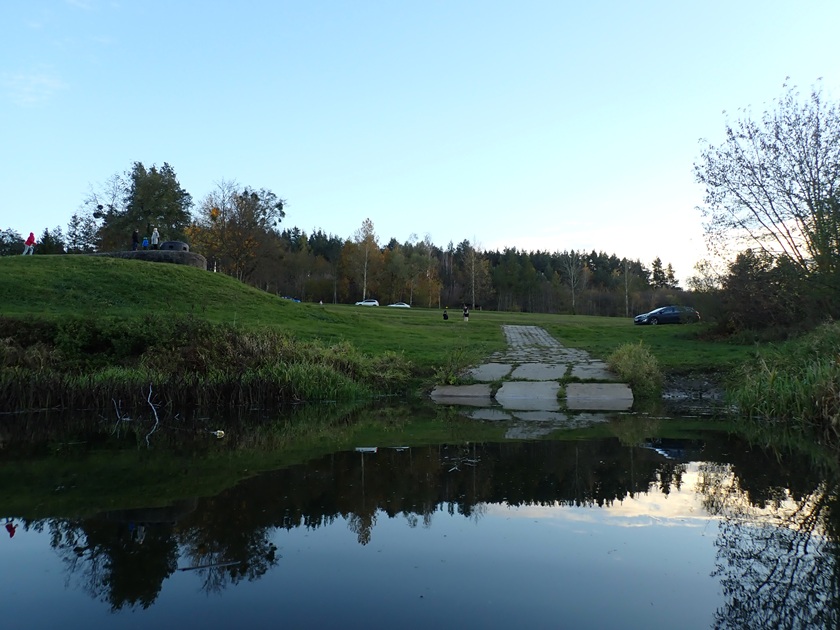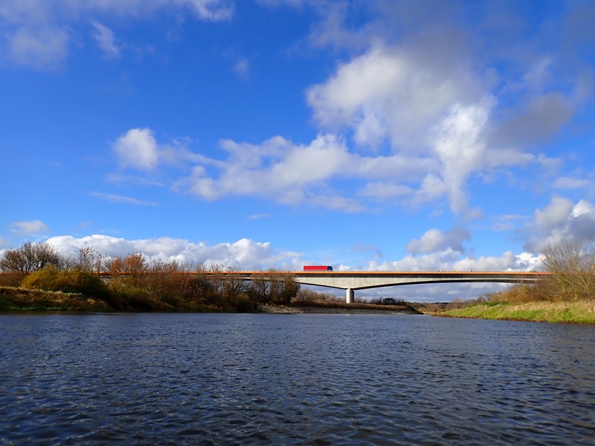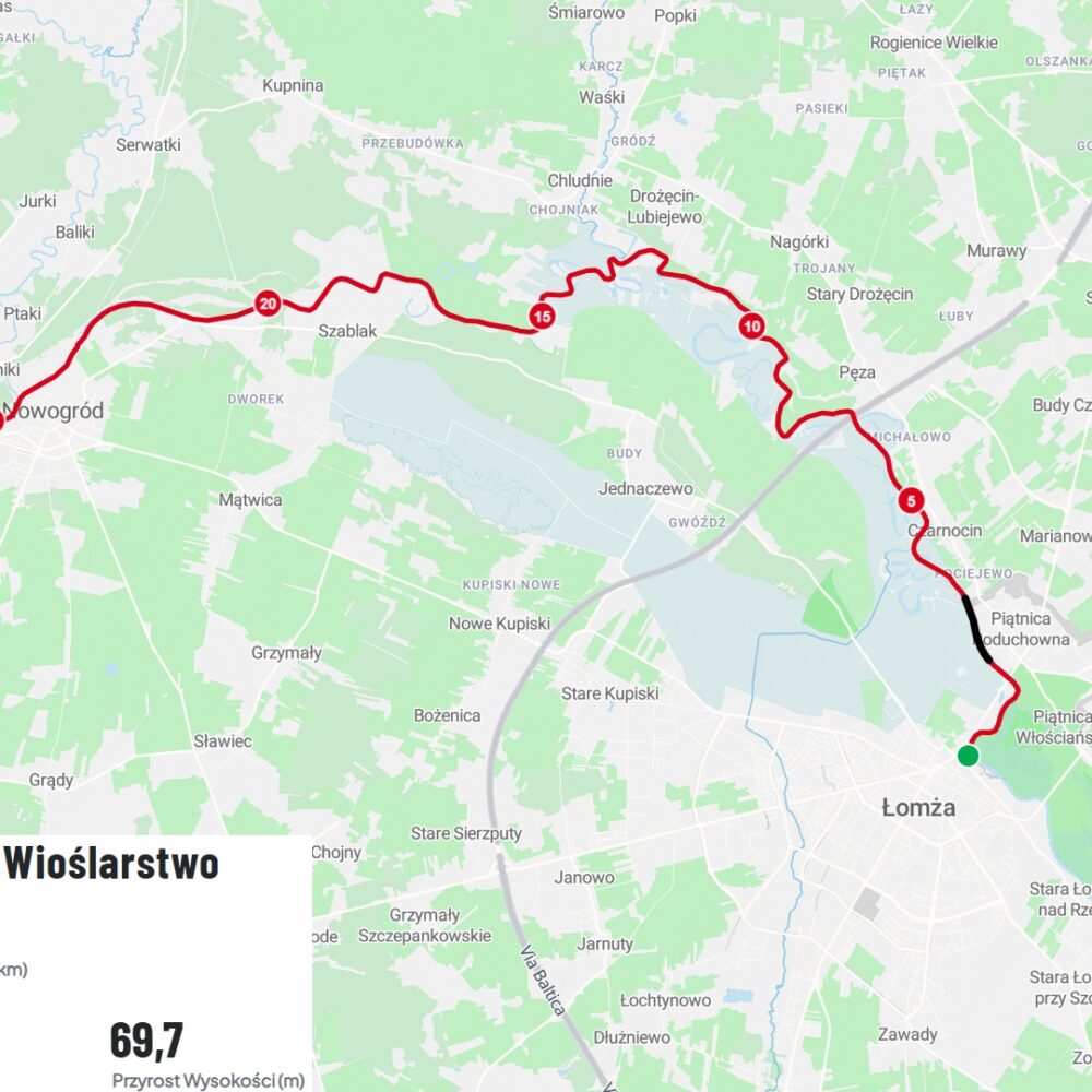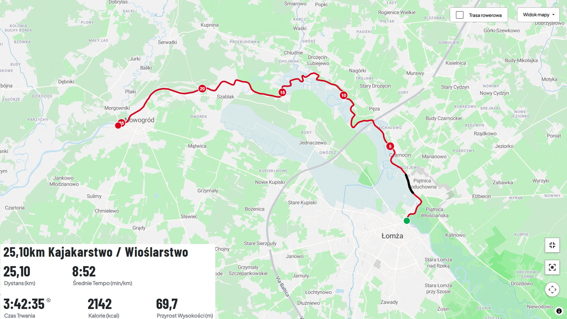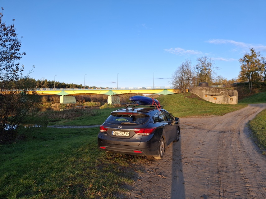 Zajęliśmy się zatem z żoną innymi ważnymi łomżyńskimi sprawami, a tu przed południem ukazuje się błękit nieba i coraz częściej przebija się słonko. Pada szybka decyzja: płynę najczęściej spływany odcinek – z Łomży do Nowogrodu. Startuję tak jak wczoraj, kwadrans przed południem. Na wodowskazie Piątnica – Łomża 93 cm. Dosyć szybko mijam most z wspomnianym wodowskazem i widocznymi w oddali zakładami mleczarskimi Piątnica. Słynne „rafy kamienne”, dzisiaj raczej spokojne bo wody wystarczająco. Wiatr dosyć silny, ale nie przeszkadzający non stop. Rzeka kręci więc raz wieje w twarz, raz w plecy i troczę w bok. Jakoś daję radę. Po niespełna godzince jestem już pod nowym mostem trasy S 61 . Dwa lata wcześniej nad rzeką stały tylko filary, rok temu auta jeździły jedną nitką drogi, dziś trasa w pełni przejezdna w obie strony. Szybko :-). Na brzegach wielu wędkarzy, ale nikt nic do mnie nie ma. I z wzajemnością ;-). Słonko świeci coraz mocniej rażąc nie miłosiernie w oczy. Dobrze że pamiętałem o okularach słonecznych i tak równo po trzech i pół godzinie jestem przy ujściu Pisy naprzeciw skansenu w Nowogrodzie. Został niespełna kilometr do mostu za którym czeka już na mnie żona. Dopływam szybciutko oglądany przez wielu ludzi odwiedzających nowo powstałą restaurację i schron bojowy przy którym kończę dzisiejsze pływanie. To był dobry weekend :-), a galeria poniżej.