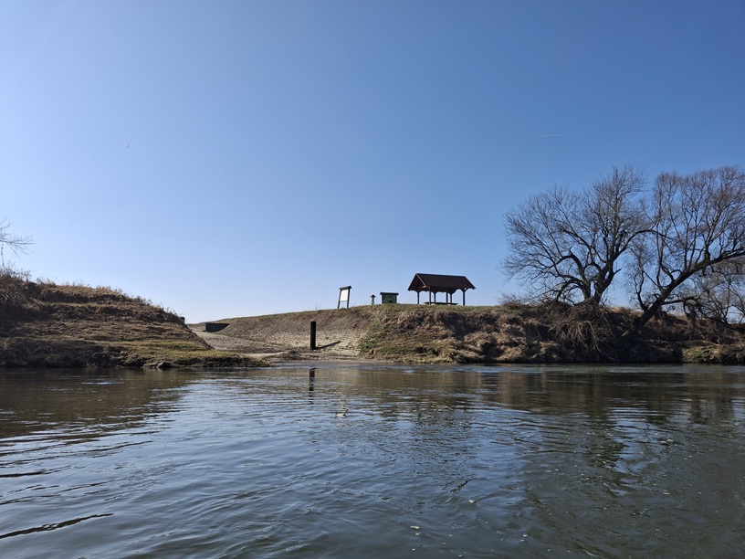 Po wypłynięciu ze starorzecza widać już metę do której podążam bez wahania i widzę resztki dymu z ogniska przy którym grzali się uczestnicy/ uczestniczki spływu który skończył się całkiem niedawno, ale nikogo już nie ma. Jedynie pozostawione kajaki na brzegu.