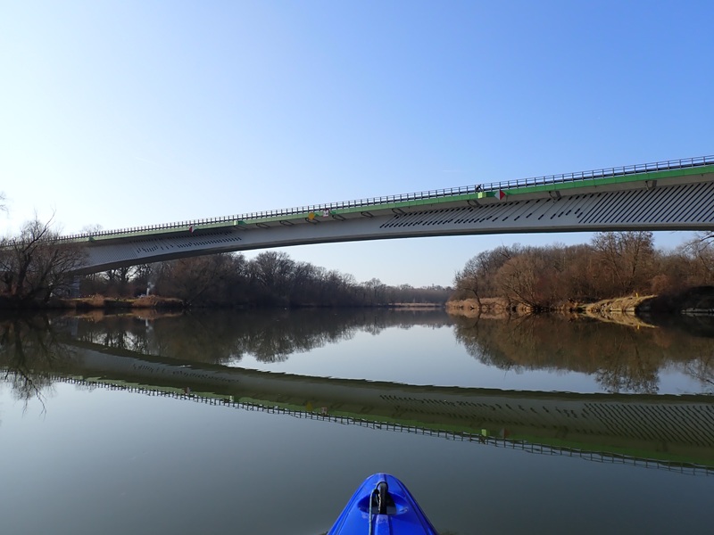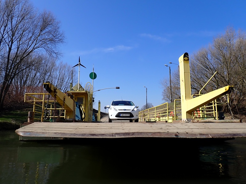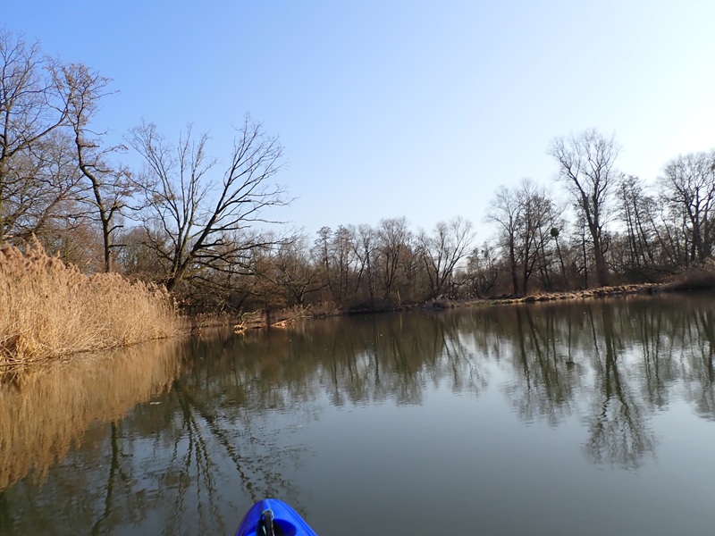 I tak punkt jedenasta schodzę na wodę pod mostem na DK 919 na Kanale Ulgi w Raciborzu. Woda niezła (wodowskaz w Miedoni wskazuje 181 cm.) Oka za bardzo nie ma na czym zawiesić bo przyroda zmuszona została do szybkiego przejścia z zimy do wiosny mimo początku marca, na termometrze już ponad dziesięć stopni a będzie jeszcze cieplej. Po godzinie i pokonanych ośmiu kilometrach jest jakiś punkt odniesienia. To nowo budowany most pięć minut przed promem pływającym pomiędzy Grzegorzowicami a Ciechowicami i dzisiaj faktycznie pływający 🙂