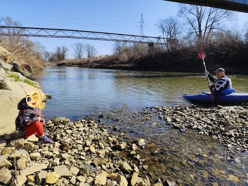 Po kolejnych dwudziestu minutach mijam ujście Gostynki i wpływam w obszar najgęściej obsadzonych wędkarzami brzegów. Momentami trudno wybrać właściwą drogę, by nie zaplątać się w żyłki. Nie słyszę czy klną na mnie czy nie, bo puściłem sobie muzykę by przyjemniej się wiosłowało. Jeszcze kwadrans i ukazują się na horyzoncie bieruńskie mosty z których pierwszy – drogowy będzie moim metowym dzisiaj. Ale to że będzie metą, nie znaczy że to dla mnie koniec wycieczki. Muszę się dostać do transportowca pozostawionego przez żonę pod miejscowym dworcem PKP. Prawie półtora kilometra od rzeki. Pomyślałem że zostawię kajak pod mostem i szybko skoczę po samochód, ale podmostowe miejsce wyglądało na często odwiedzane przez różnych ludzi, no i akurat gdy szykowałem się do marszu, pojawiła się jakaś parka obserwująca mnie i rzekę.