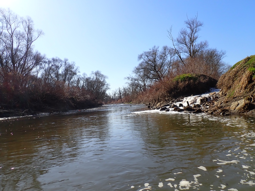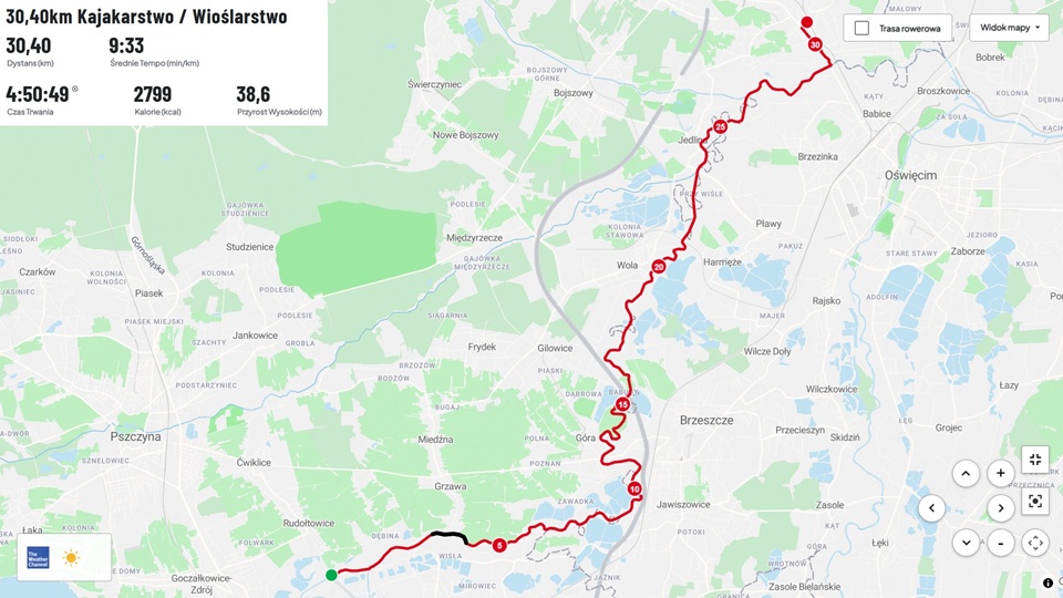 Na start przy przepuście rurowym zawozi mnie żona z wnuczkiem. Szybko zrzucam się na wodę która jest (niby) czterdzieści cm. wyższa niż jedenaście miesięcy wcześniej (wodowskaz Jawiszowice 260 cm.) Piszę niby, bo spoglądając na wodę wydaje mi się nawet niższa niż w tamtym roku :-(. Tuż po dziesiątej startuje, obserwując podchodzące do lądowania na bardzo pobliskim lotnisku bardzo nisko przelatujące nad rzeką, awionetki.
