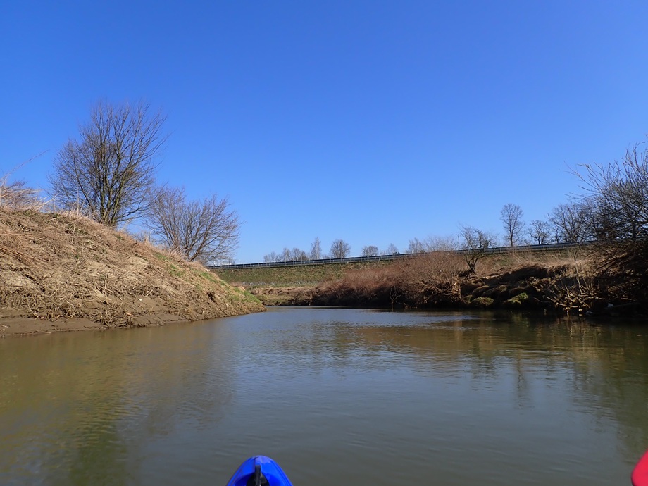 Rzeka wydaje mi się jakaś dziwna, spokojna i szara. Mało przyspieszeń, kilka przemiałów i bystrzy, mało ptaszków za to piękna pogoda. Siedemnaście stopni na plusie w połowie marca. Czasem trochę mocno wieje, ale na tym odcinku Wisła jeszcze sporo meandruje, tak więc wiatr czasem w twarz, ale bywa i w plecy więc spoko. Po pięciu kwadransach pojawia się widok niebieskiej, stalowej kładki łączącej oba brzegi rzeki a tuż za nią szeroka i czysta , spławna rzeka. Po pięciu latach zniknął wreszcie zator pokonanie którego zabierało trochę czasu i siły. Fajnie. Kolejne pięć minut i kończy się pływanie w ciszy bo zbliżam się do nowej drogi ekspresowej S1. Już czynna więc słyszalna.