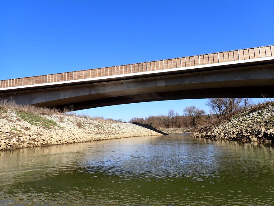 Na chwilę oddalam się od drogi wijącą się rzeką, by po dwudziestu minutach dopłynąć do mostu w miejscowości Góra przed którym w minionym roku zadziało się coś przez co powstało małe bystrze, a brzegi wyłożone zostały płaskimi kamiennymi płytami co zaprezentowałem na zdjęciu profilowym tego opisu. Za Górą dwadzieścia pięć minut i znowu jestem przy S1, a właściwie pod drogą, bo jest nowy most. Nie wiem co za moda, że każdy nowy most obudowany jest setkami metrów sześciennych ładnych desek, tak by jadąc autem nie można było zobaczyć wody. Nie rozumiem tego :-(.