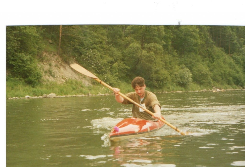Miałem już coraz więcej znajomych wśród kajakowej braci , tak więc pojawił się pomysł spłynięcia całego Tygodnia Dzikich Wód a przedtem Dolnego Dunajca. Jako , że nie bardzo było jak się dostać do miejsca startu, wymyśliłem ,że pojedziemy z kolegą do Nowego Sącza. Kimniemy kilka godzinek nad rzeką i spłyniemy o czwartej rano do miejsca rozpoczęcia spływu (około 22 km.). Plan był dobry, dopłynęliśmy do okolic miejsca startu punktualnie z tym że źle odczytany regulamin sprawił to że byliśmy punkyualnie, ale 24 godziny przed godziną startu 👿 na miejscu nikogo, ani żadnej wiadomości. Wkurzeni i znudzeni szwędaliśmy się po głównej ulicy bez pomysłu co robić dalej. Po południu ukazał nam się autobus- poczciwy „ogórek” w którym jak się okazało jechali ludzie na spływ , a wśród nich jeden mój dobry znajomy – Rysiek K. z Krakowa, który nas dojrzał i poprosił kierowcę by nas zabrać. Od tej pory wszystko poszło już świetnie mimo tego, że jak się okazało do naszego składanego neptuna zapomniałem zabrać dmuchanych kich 👿 Dolny Dunajec udało się przepłynąć…