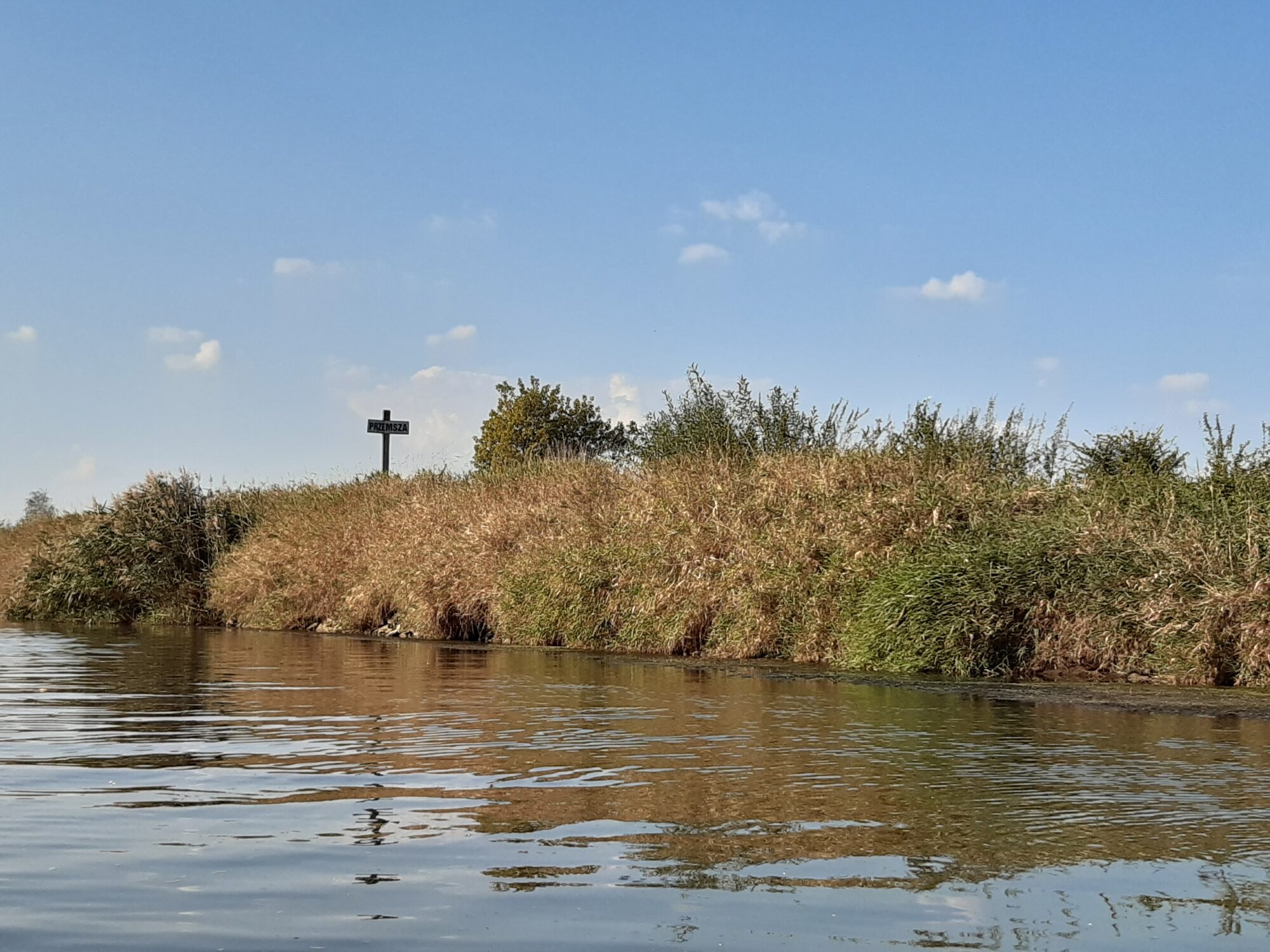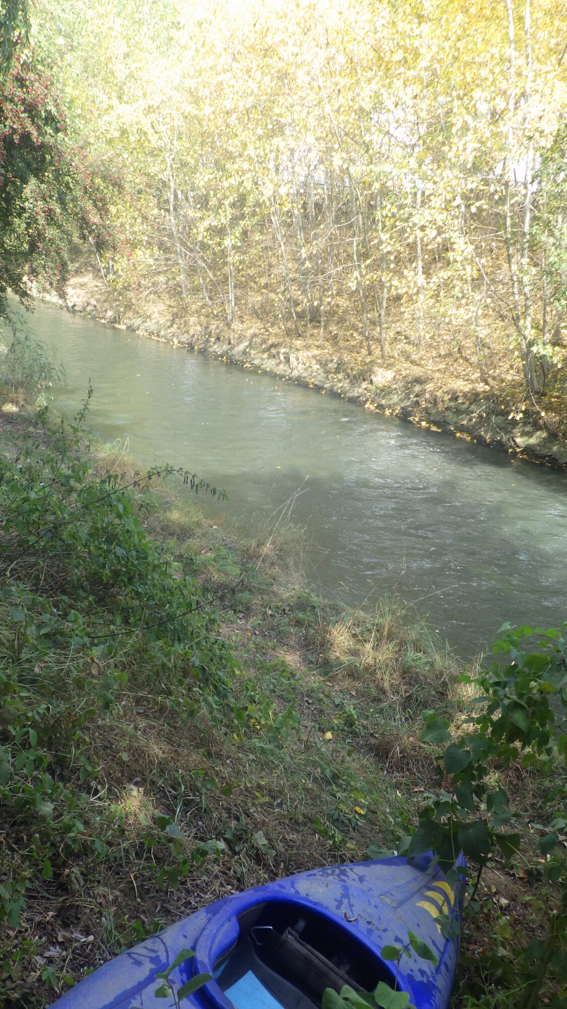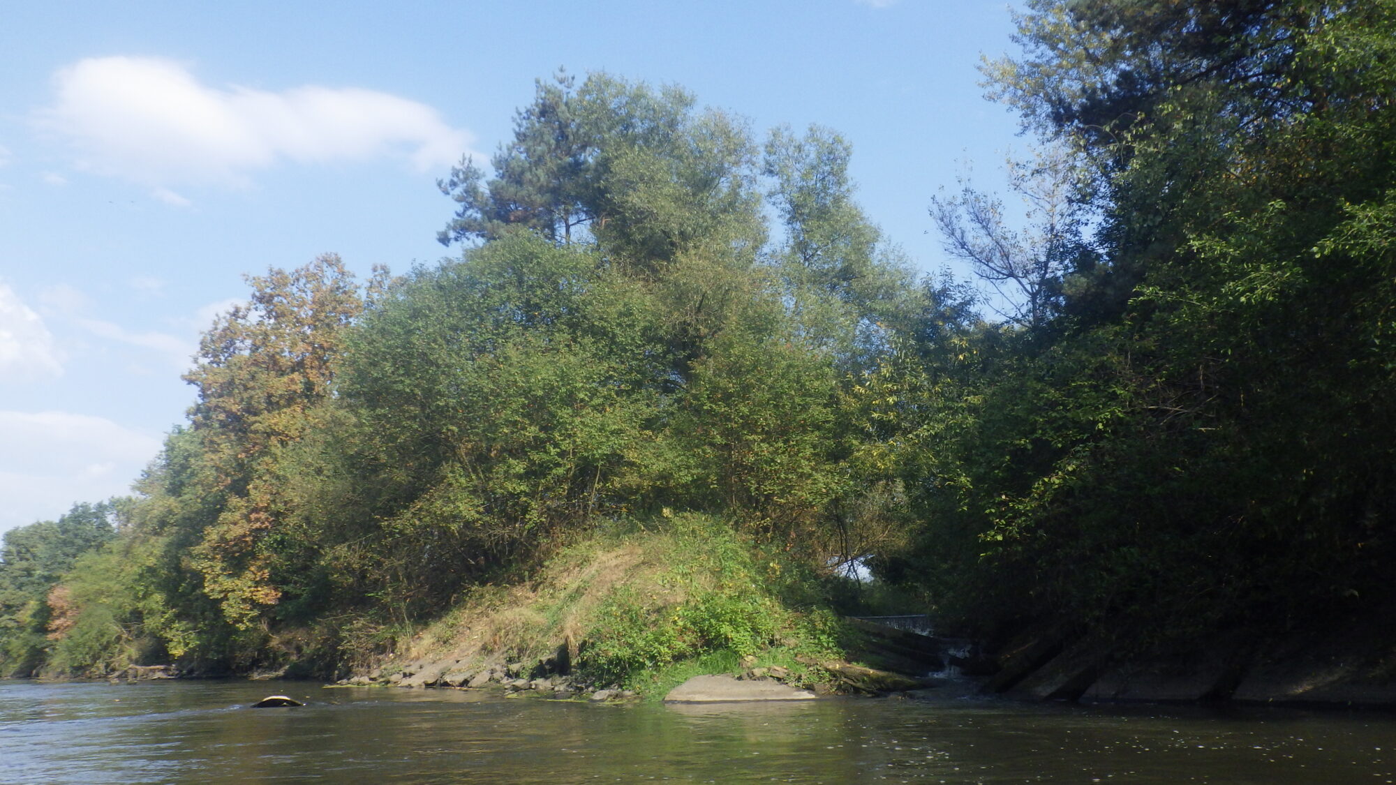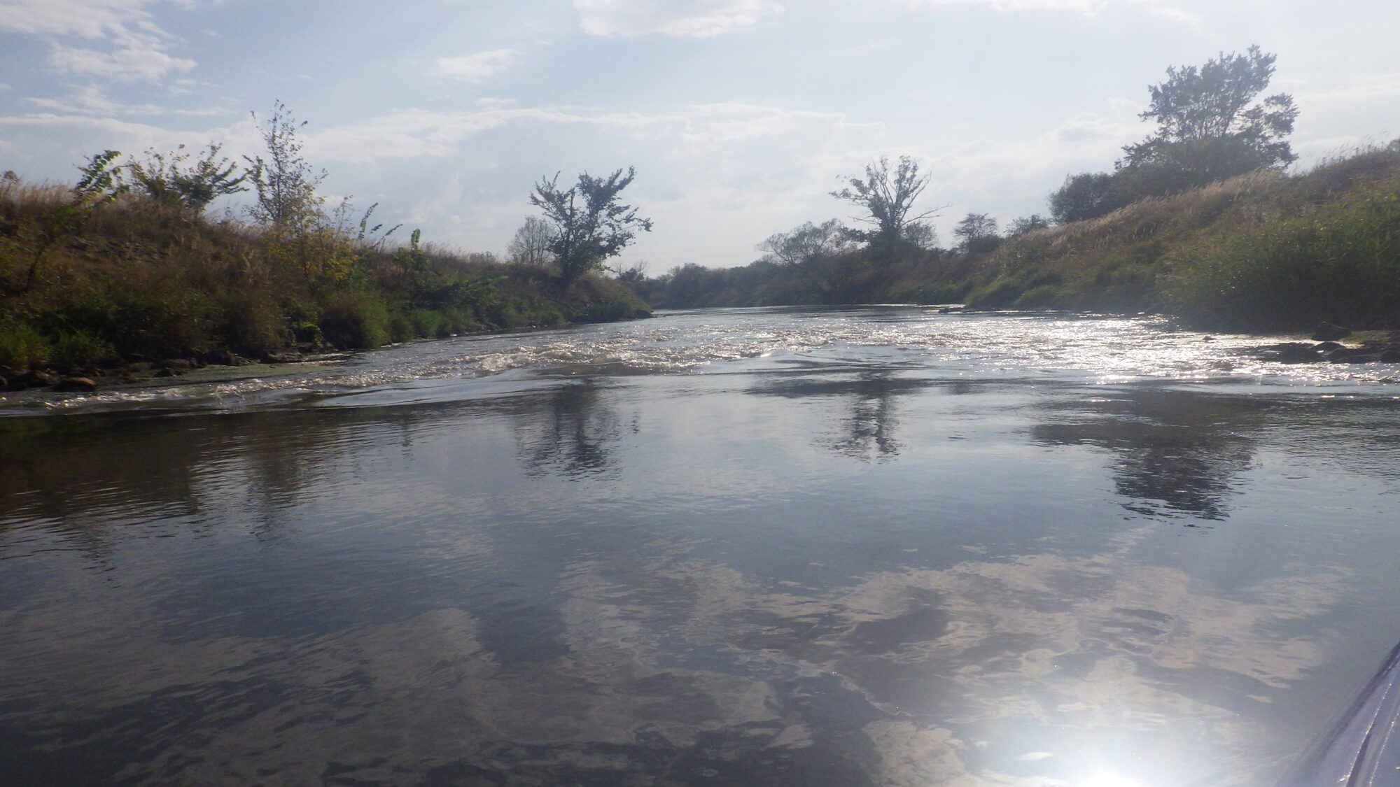 Od teraz już na spoko, jeszcze kilka lekkich bystrzy i ciągłe zamyślenie czy przy obecnie niskich stanach wody nie będzie zbyt wysoko nad wodą wystawała rura gazowa, którą kilkakrotnie przecierałem dnem mego kajaka. Okazało się, że dziś rury nawet nie zauważyłem, czyli poziom nie był rekordowo niski i dobrze, choć tempo mego dzisiejszego płynięcia wskazuje jakby co innego. Rura jest dla mnie wyznacznikiem ;-). Przed 16,30 dopływam do Wisły. A tu na cyplu pozostała już tylko tabliczka Przemsza. Zero które jeszcze w tamtym roku tu stało, zniknęło. Ciekawe czy ktoś zachował sobie na pamiątkę? Wszak to miejsce kultowe ;-), Wielu ludzi corocznie pływa „całą Wisłę” zaczynając właśnie od zera. Tak jak ja w ubiegłym roku 🙂
