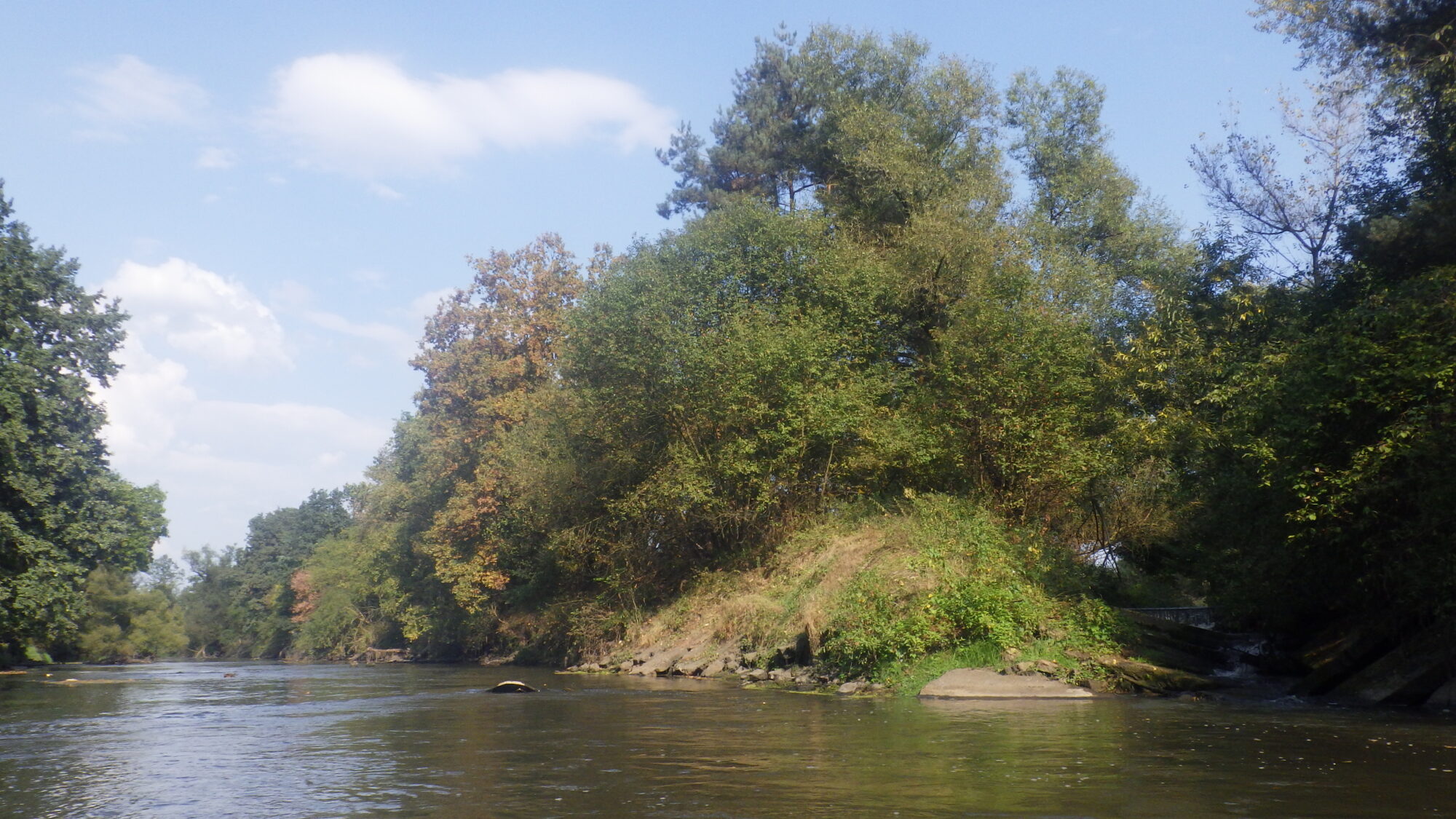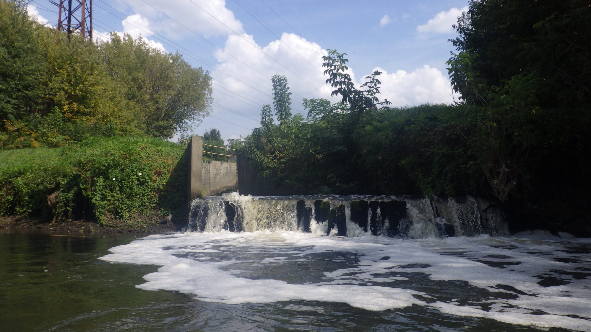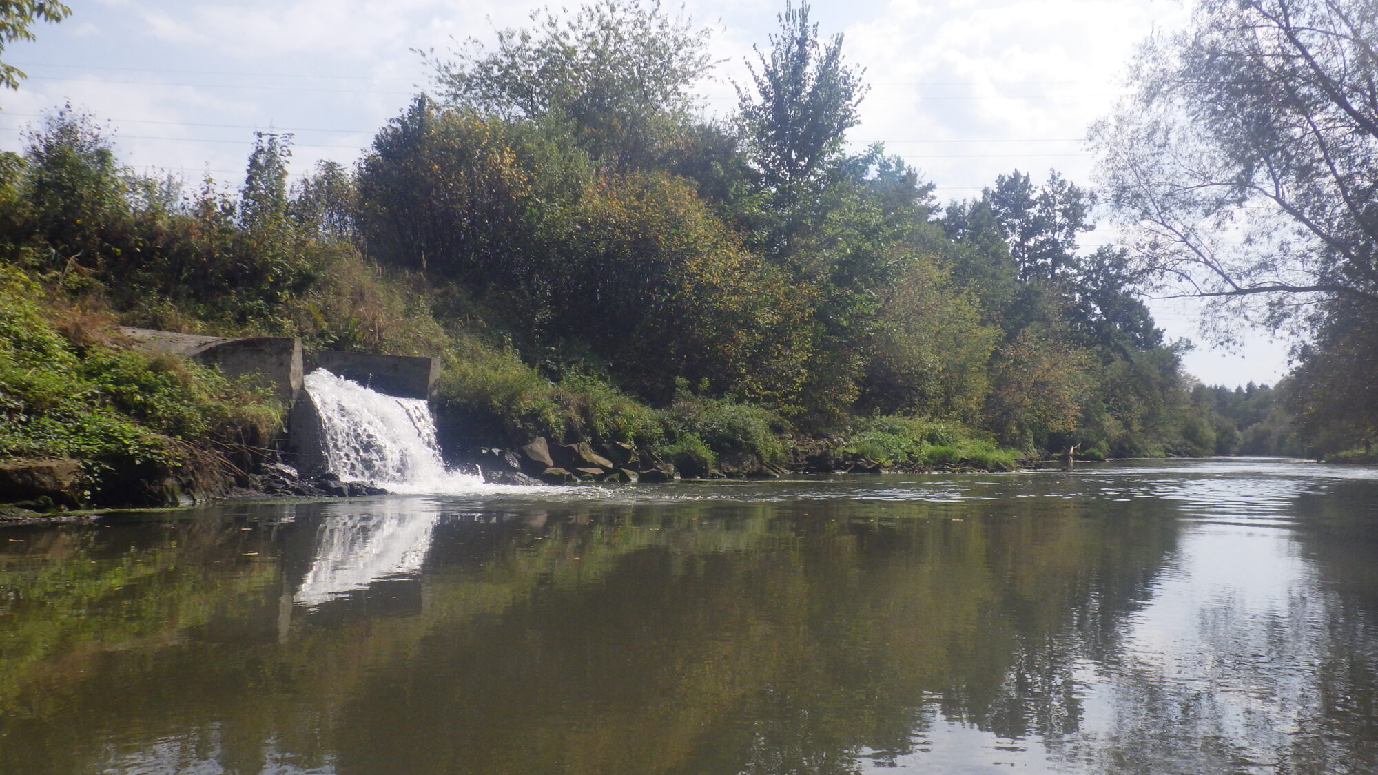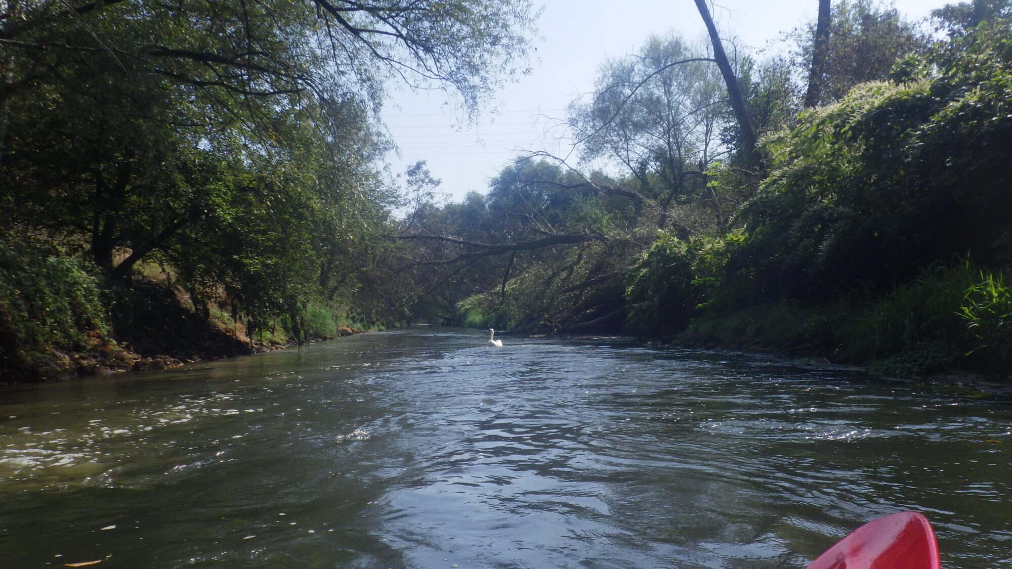 Próg przez który Brynica wpada do Czarnej Przemszy, obnoszę i po chwili przerwy ruszam dalej, prowadzony już tylko przez ojca łabędziej rodzinki. Zaczynają się kamieniste bystrza, a ten się nie poddaje ginąc momentami pod falami. Dopływamy razem do połączenia z Białą Przemszą , to blisko cztery kilometry i gdyby nie to, że zaplątał się w przybrzeżnej roślinności pewnie doholował by mnie do Wisły. Minąłem go a on wrócił do swoich. Po pół godzinie jestem pod mostem Wysoki Brzeg i po szybkim rekonesansie postanawiam obnieść. Przy okazji posilę się trochę i uzupełnię płyny. Ta woda nie pachnie najlepiej, dlatego nie mam ochoty na moczenie od szyi w dół, a tak mnie tu moczyło, gdy jeszcze tędy spływałem.