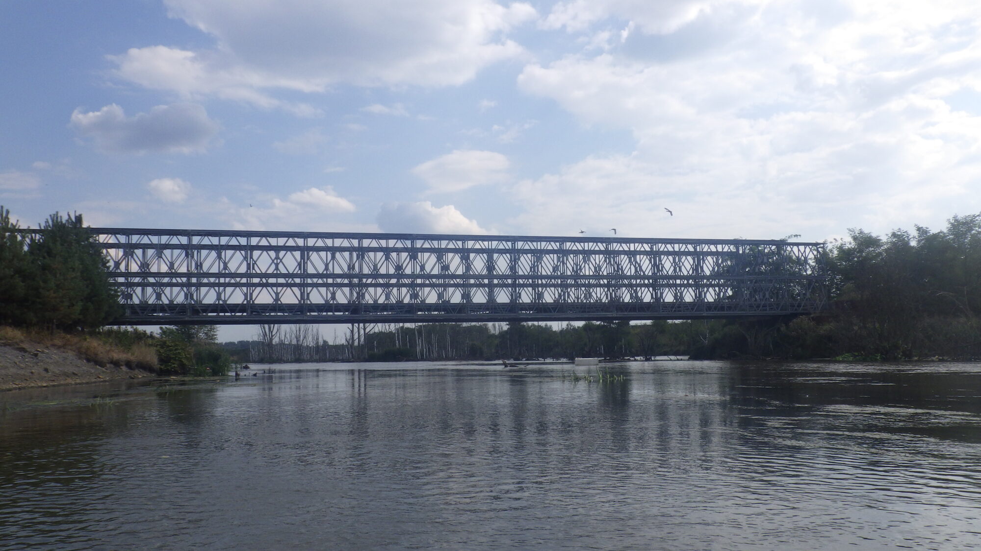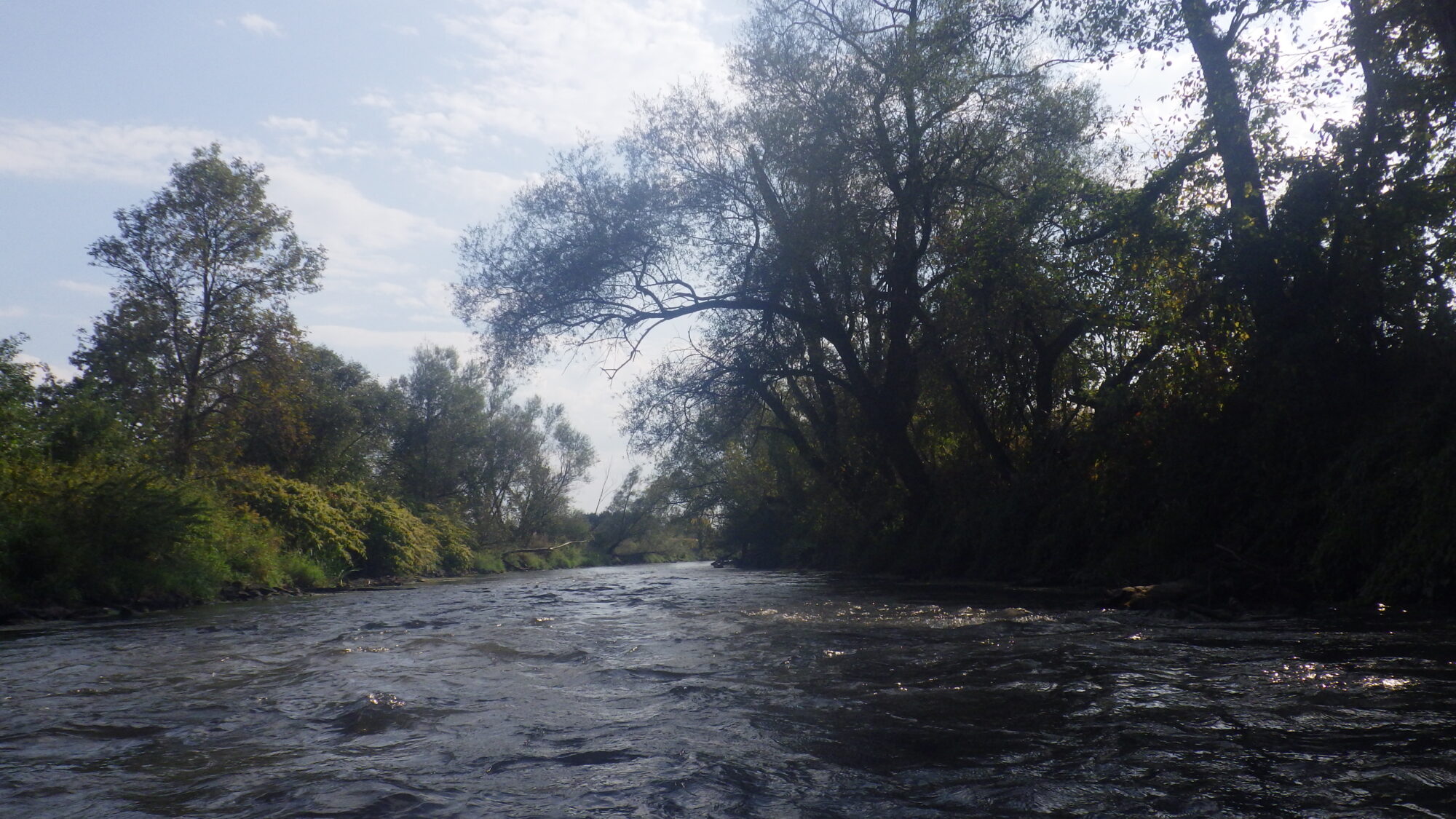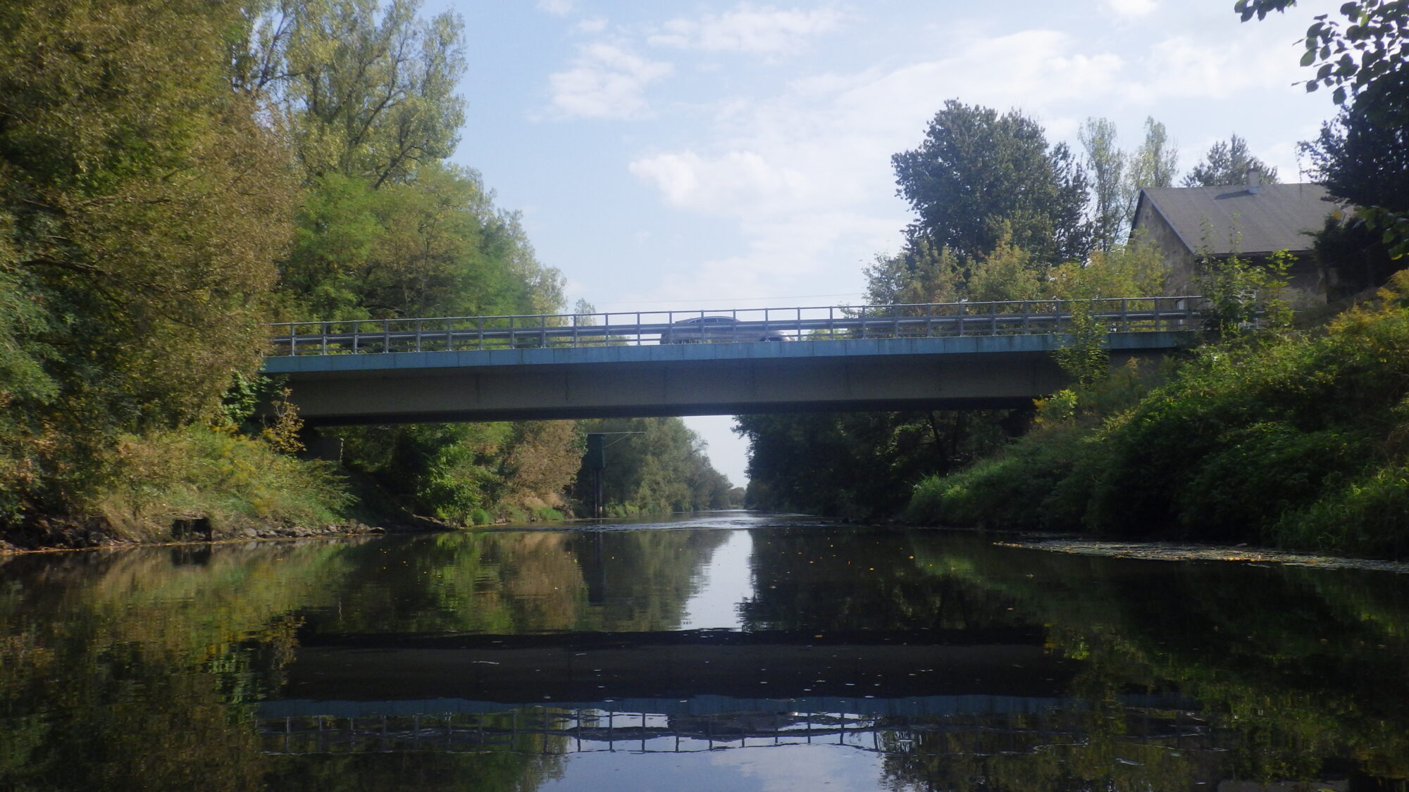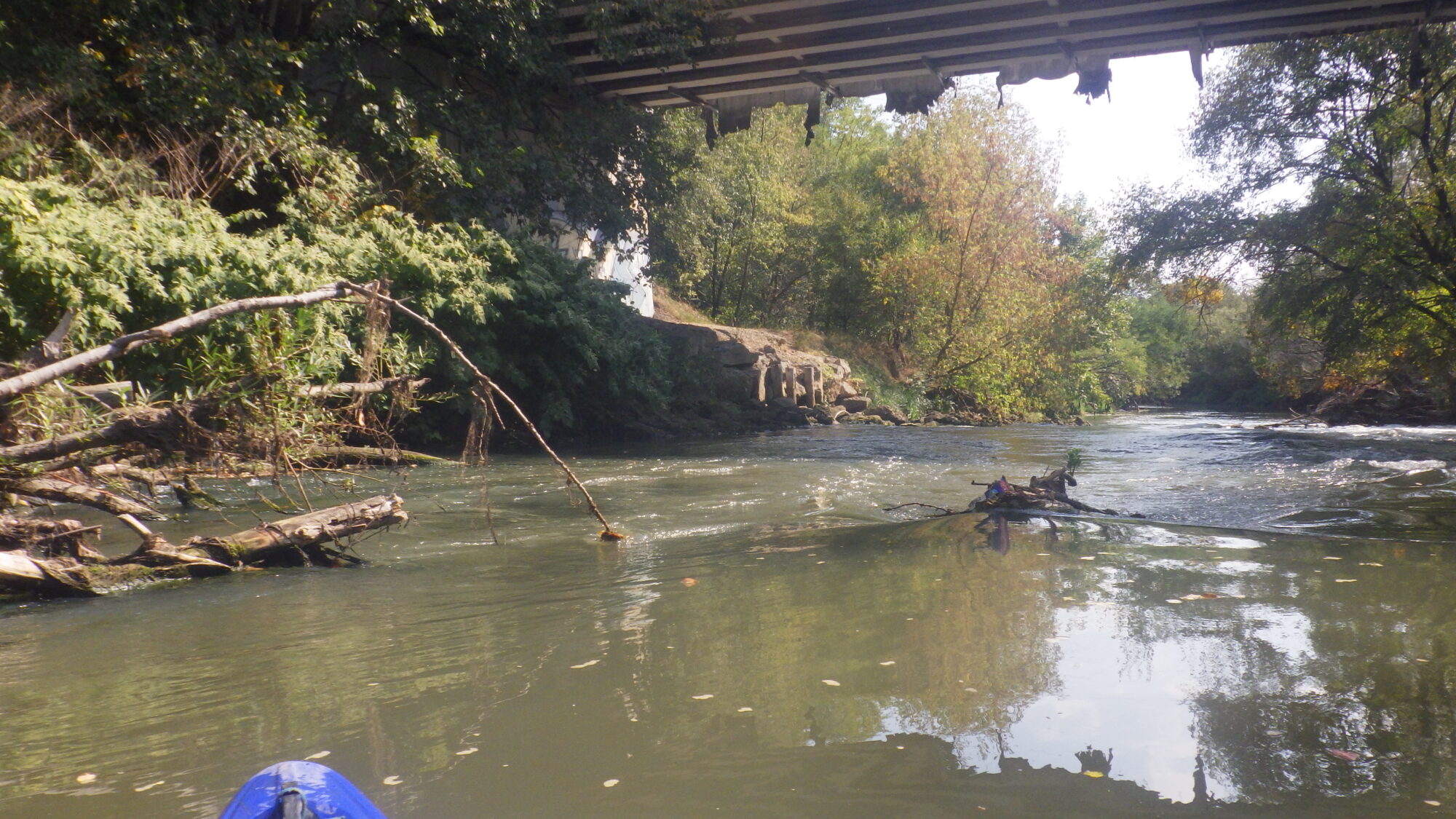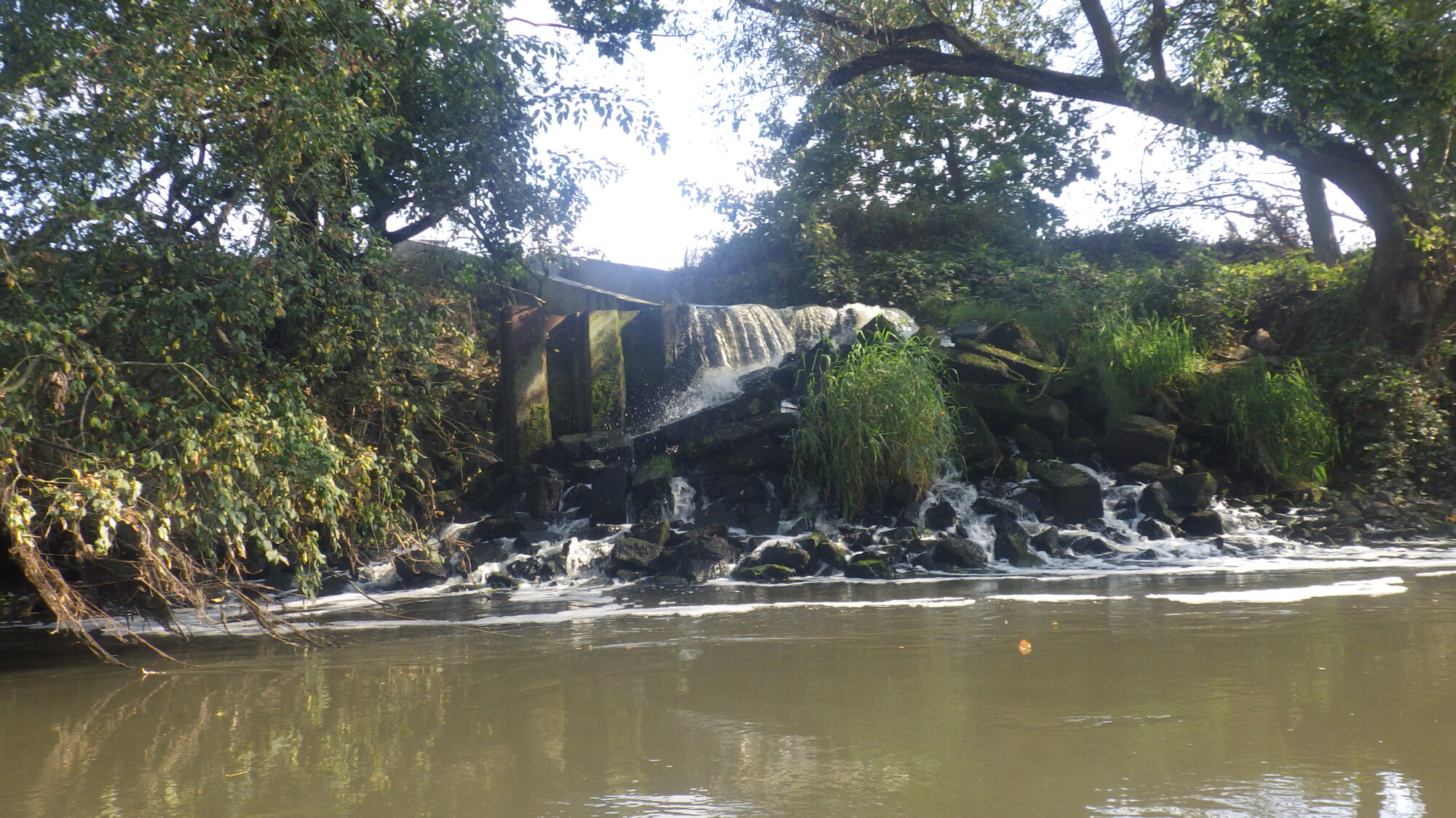 Próg przez który Brynica wpada do Czarnej Przemszy, obnoszę i po chwili przerwy ruszam dalej, prowadzony już tylko przez ojca łabędziej rodzinki. Zaczynają się kamieniste bystrza, a ten się nie poddaje ginąc momentami pod falami. Dopływamy razem do połączenia z Białą Przemszą , to blisko cztery kilometry i gdyby nie to, że zaplątał się w przybrzeżnej roślinności pewnie doholował by mnie do Wisły. Minąłem go a on wrócił do swoich. Po pół godzinie jestem pod mostem Wysoki Brzeg i po szybkim rekonesansie postanawiam obnieść. Przy okazji posilę się trochę i uzupełnię płyny. Ta woda nie pachnie najlepiej, dlatego nie mam ochoty na moczenie od szyi w dół, a tak mnie tu moczyło, gdy jeszcze tędy spływałem.
