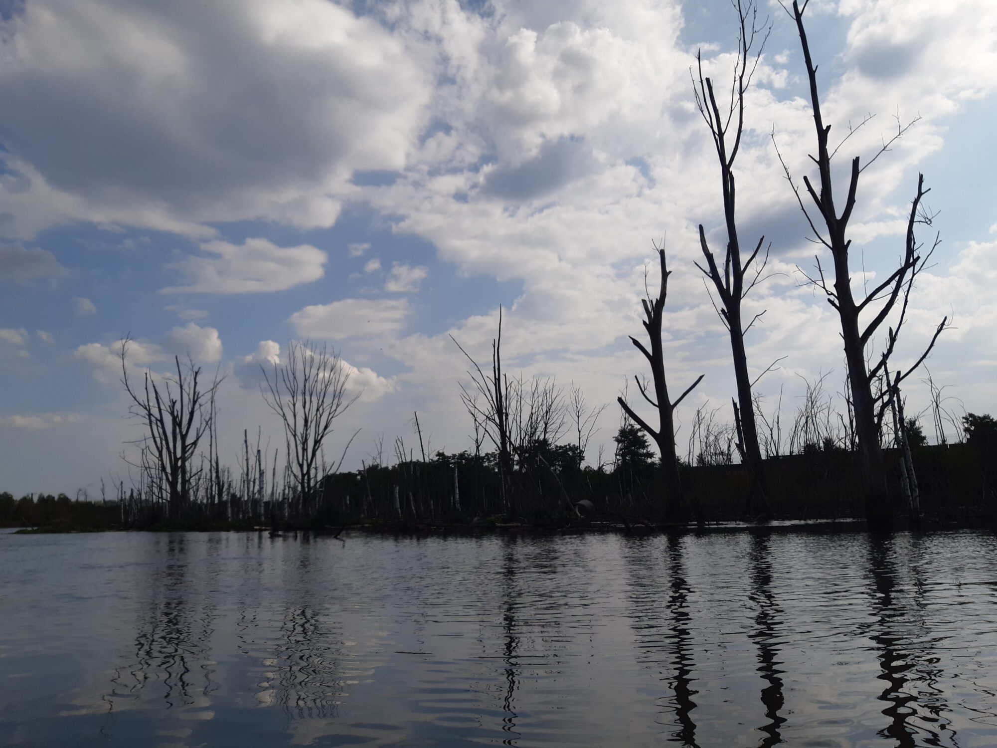 Prawie godzinę zajmuje mi dopłynięcie do miejsca nazwanego w mapach google zapadliskiem w Przemszy. To rozlewisko porośnięte kikutami drzew z przewagą brzóz. Mam wrażenie że cały ten las, pomiędzy którym w zimie przy wyższej wodzie udawało mi się popływać, jest coraz mocniej wspomnieniem lasu przez te kikuty :-(.